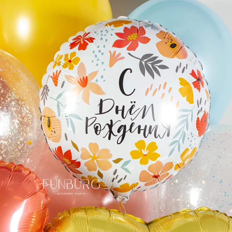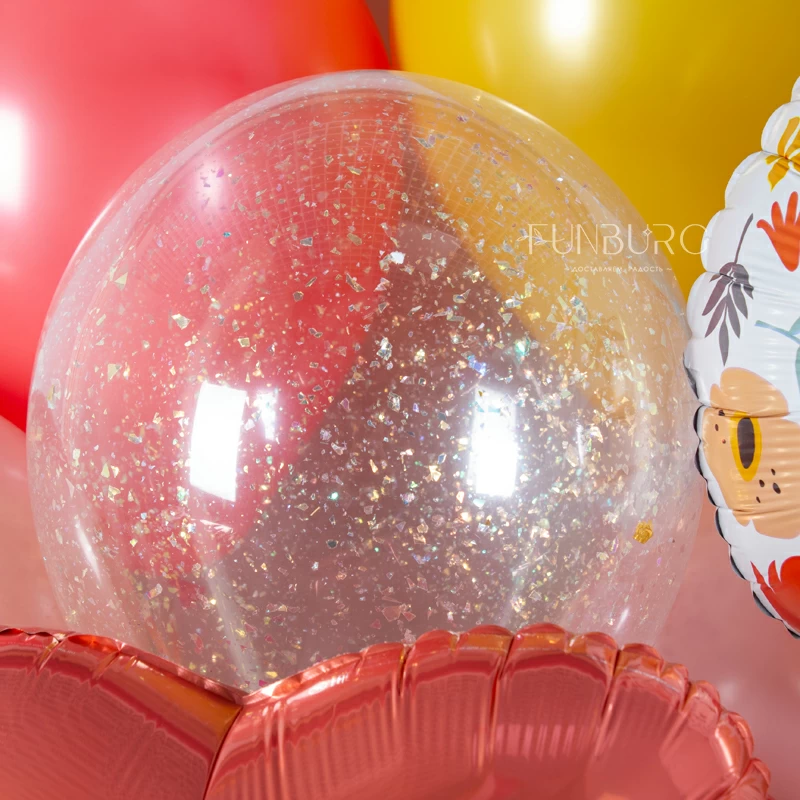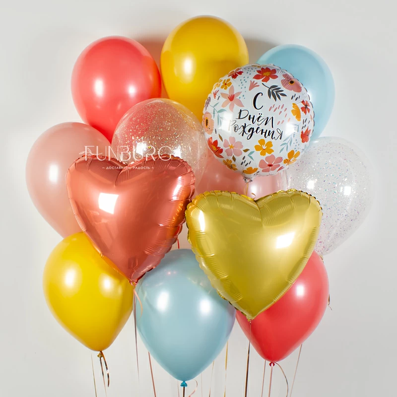 Необычное и неожиданно гармоничное сочетание кораллового, горчичного, пудрового и мерцающего небесно-голубого согревает теплом мягкого южного ветра и передает самые нежные чувства. Шарики без рисунка идеально дополняют цветочный орнамент на шарике с поздравлением, а необычные перламутровые конфетти переливаются похожими оттенками и придают торжественность и завершенность композиции.