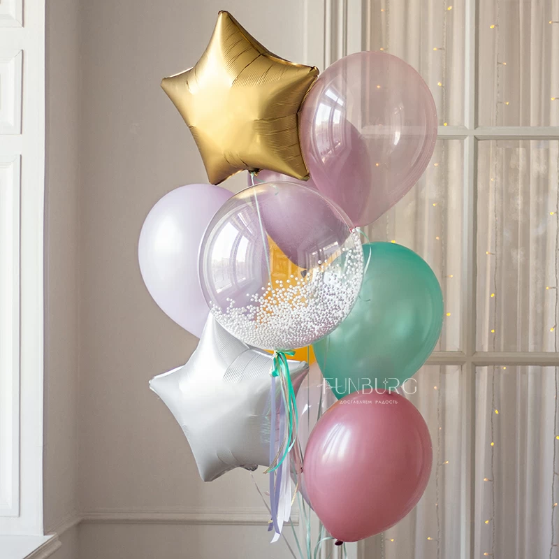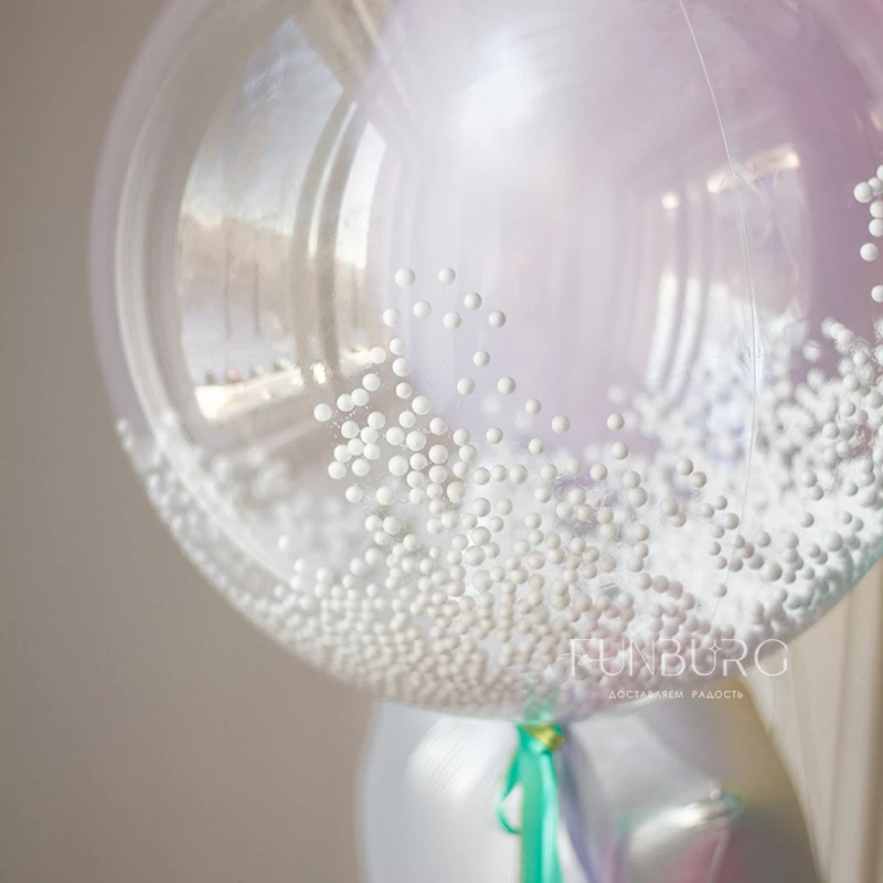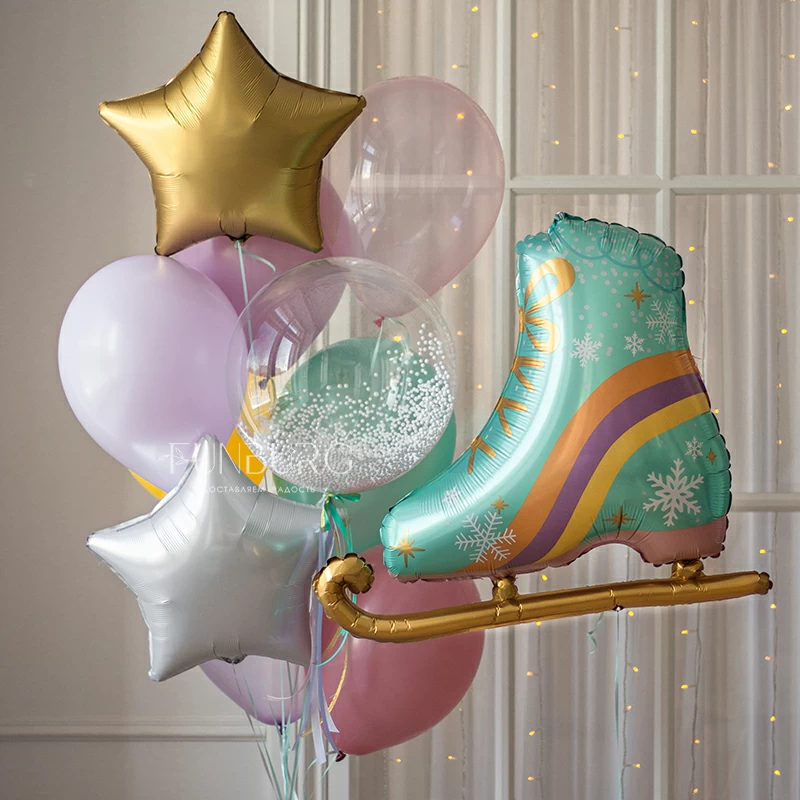 Нежная и яркая связка шариков с снежным шаров Bubble и звездами и красивый шарик в виде конька идеально подойдет тем, кто связан с фигурным катанием или просто для необычного украшения тематического зимнего праздника.