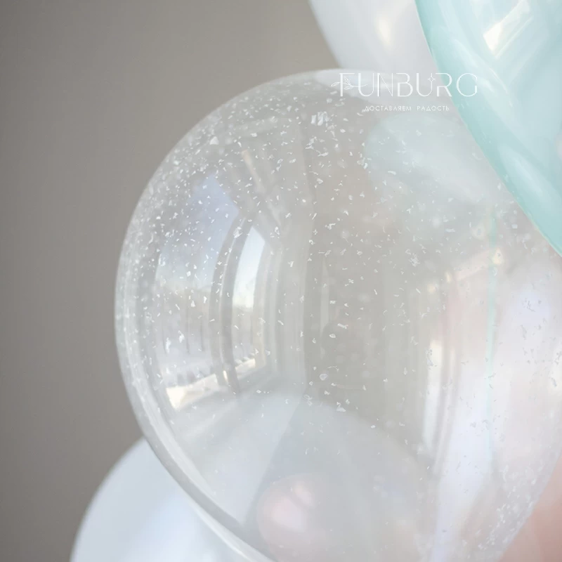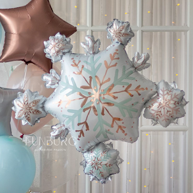 Красивая фигурная мерцающая снежинка и нежная-снежная связка шариков ей в тон станут отличным украшением зимнего праздника и Нового года!