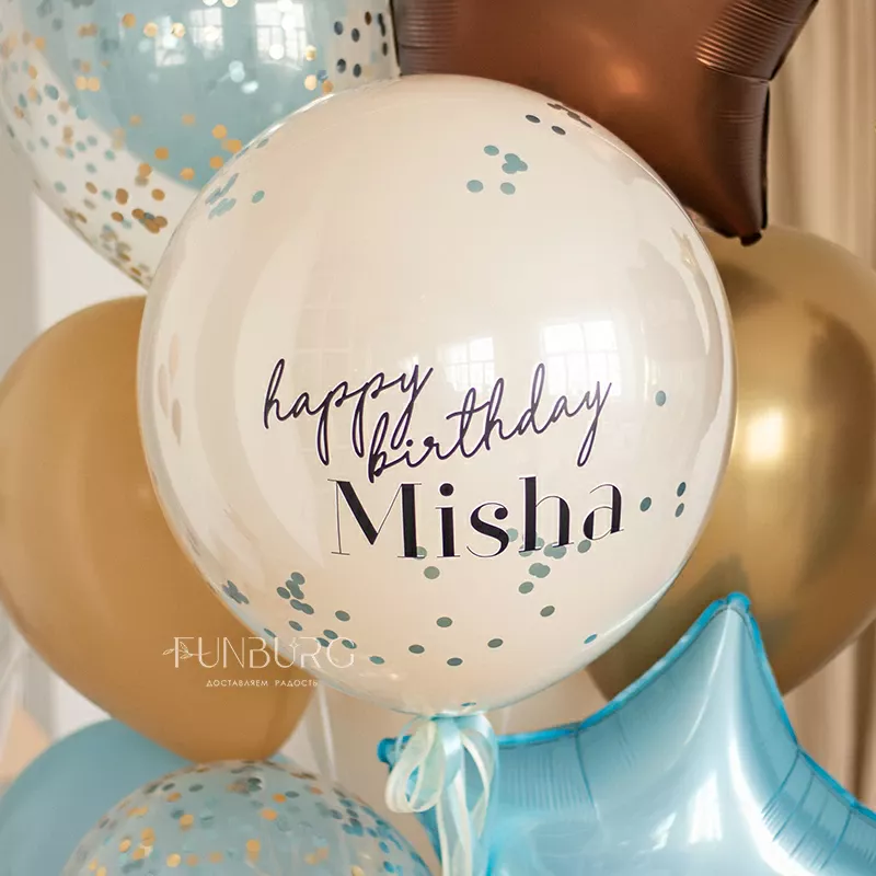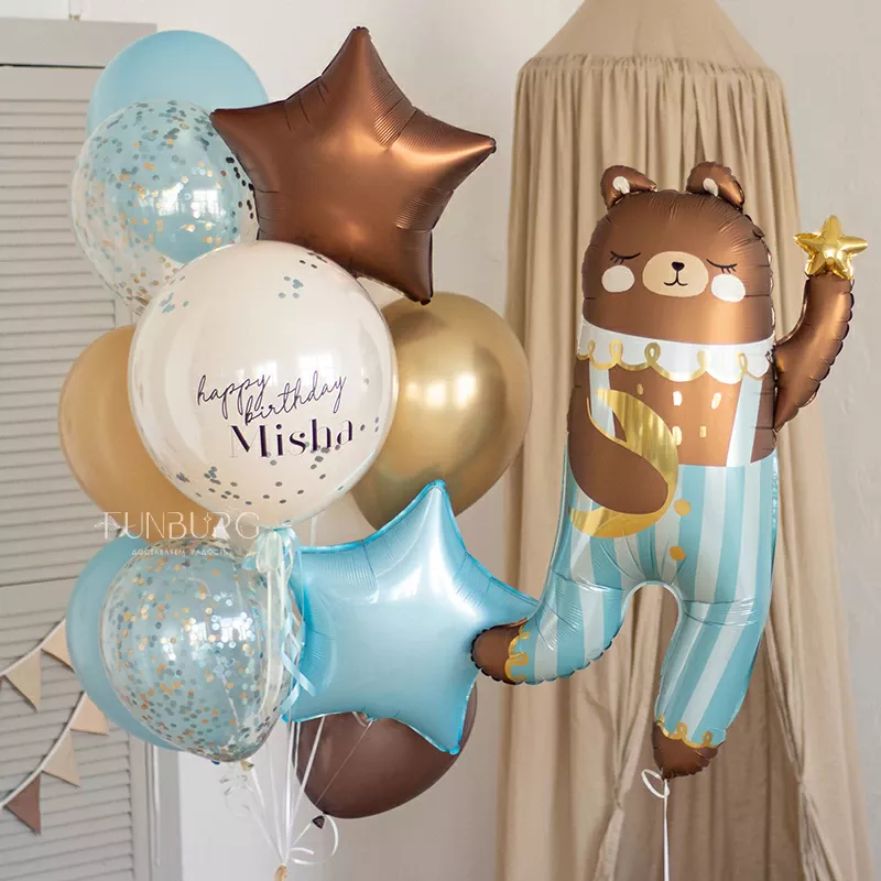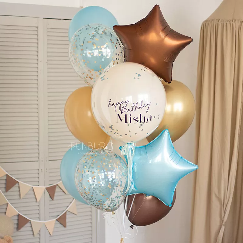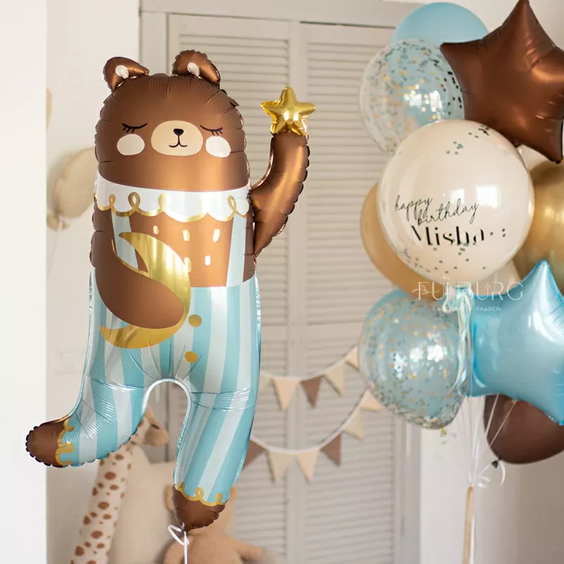 Обаятельный мишка с полосатых штанишках, который как будто ловит на небе звездочки, дополненный связкой шариков в тон, с большим стеклянным шаром с конфетти и именным поздравлением (надпись можно сделать любой) идеально подойдет для лаконичного и стильного украшения дня рождения и подарка имениннику!