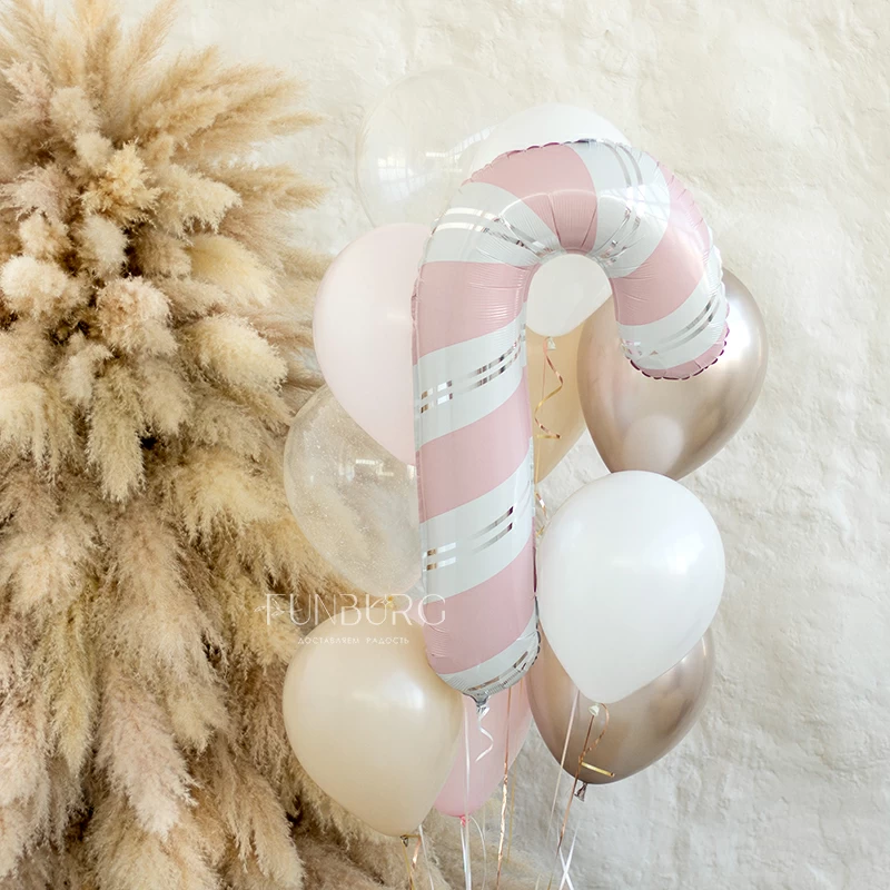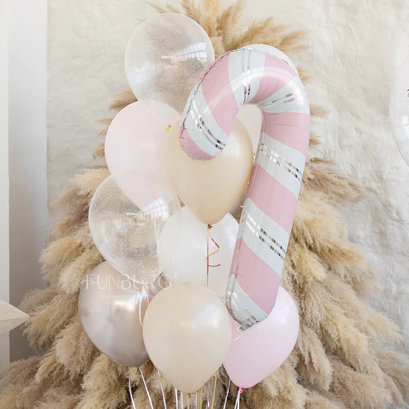 Сладкий, всеми любимый символ Рождества, а теперь и Нового года, candy cane, или карамельная трость, в необычном нежно-розовом цвете и в окружении таких же сливочных оттенков: кремового, снежно-белого, мерцающего оттенка шампань. Для более волшебного снежного настроения мы дополнили этот зефирный вихрь шариками со снежинками-конфетти и сверкающими, как льдинки на солнце, серебряными кругами.