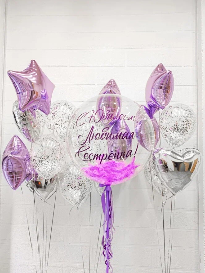 Шар баблс + сиреневые перья + ваша надпись.