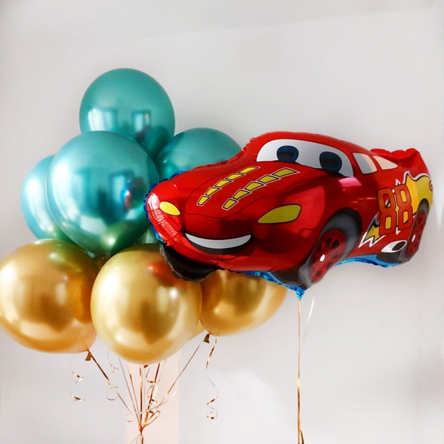 Облако шаров хром с фигурой “Весёлый гонщик”
