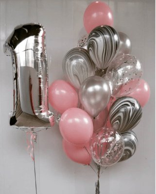 Облако шаров в серебристо-розовом цвете с цифрой один
