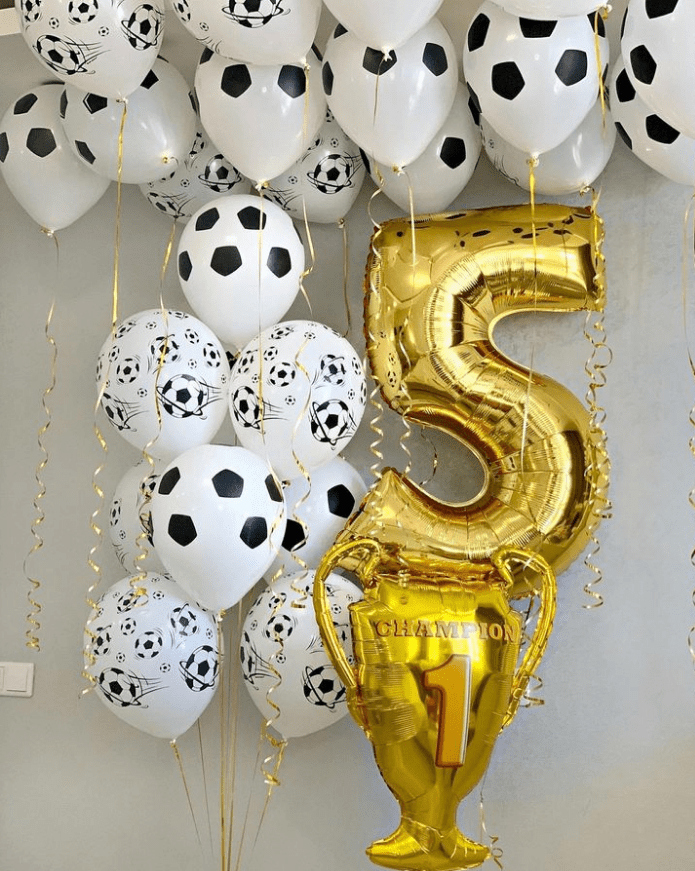 Оформление гелиевыми шарами на пять лет в футбольной стилистике