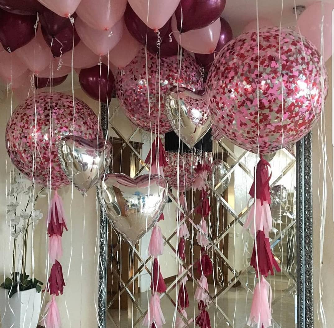 Оформление комнаты шарами под потолок, фольгированными сердцами и шарами с конфетти