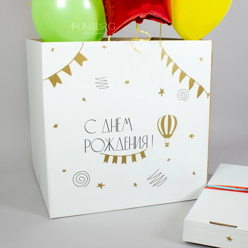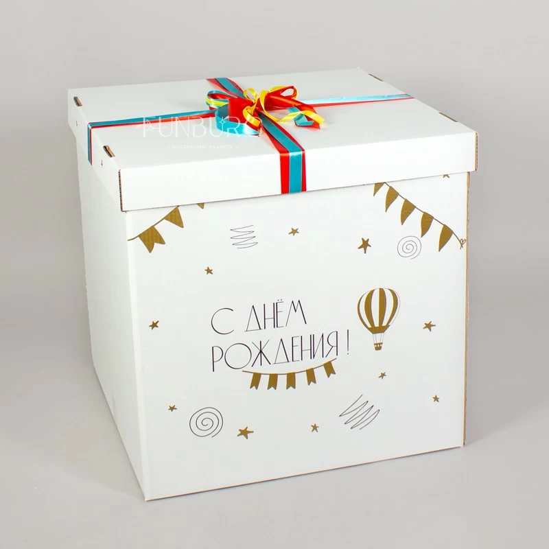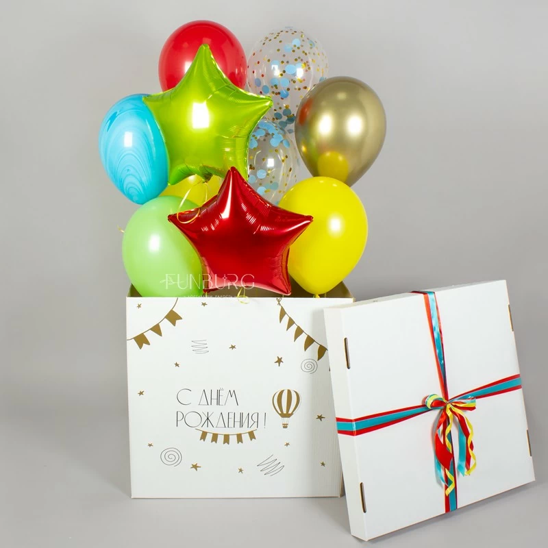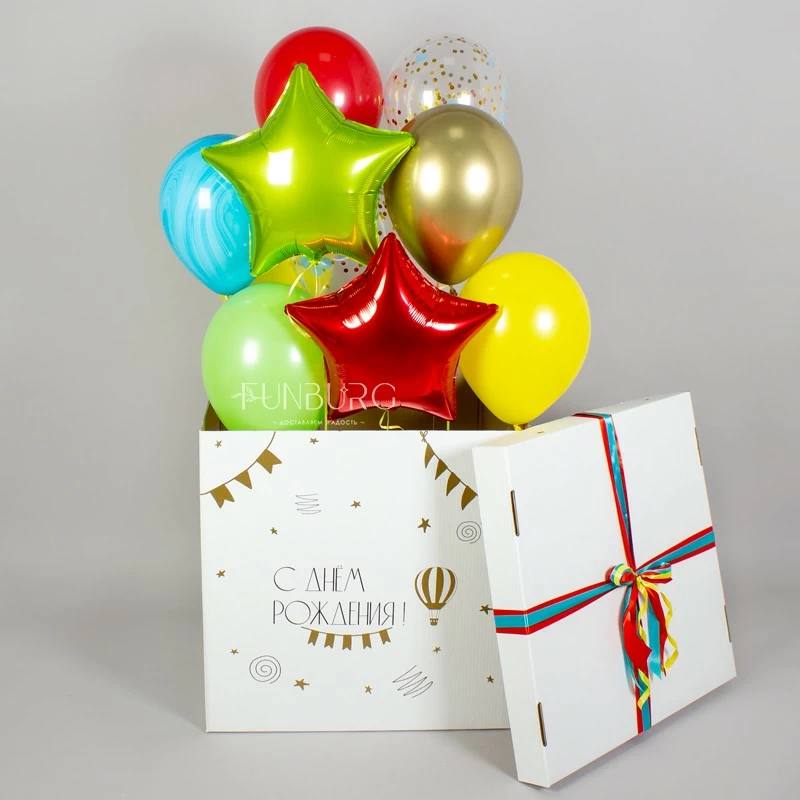 Коробка украшена тематическими наклейками и атласной лентой. По вашему желанию надпись на коробке, а также цветовую гамму шариков мы можем изменить.