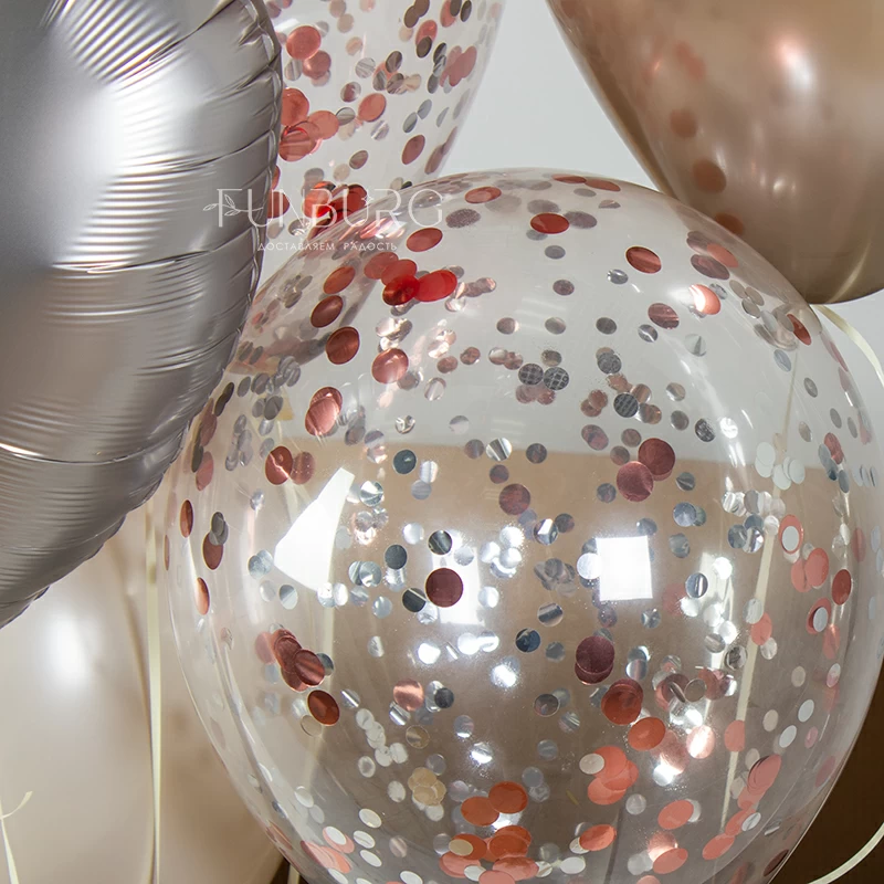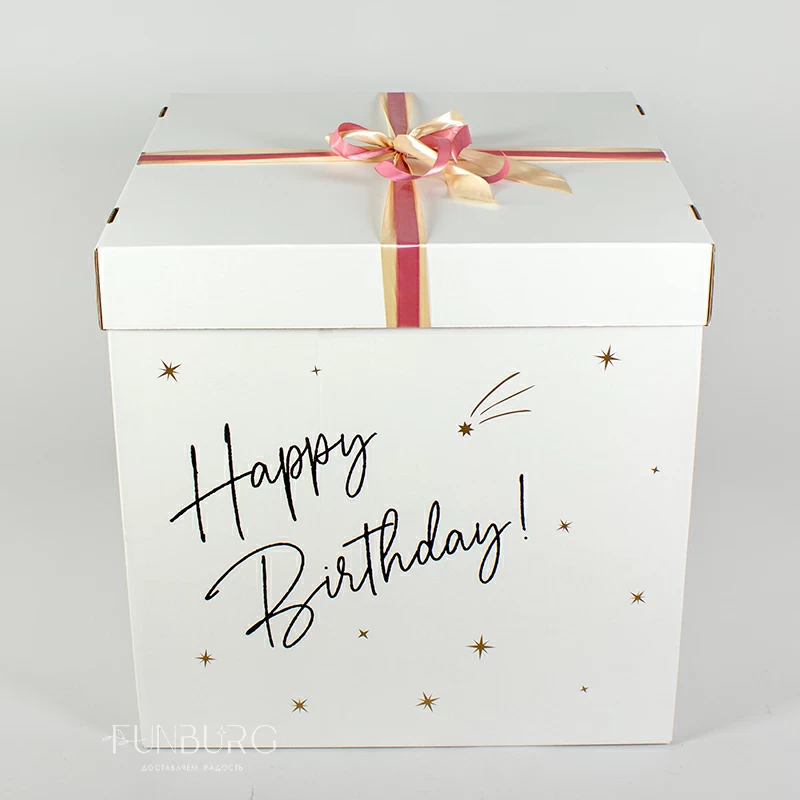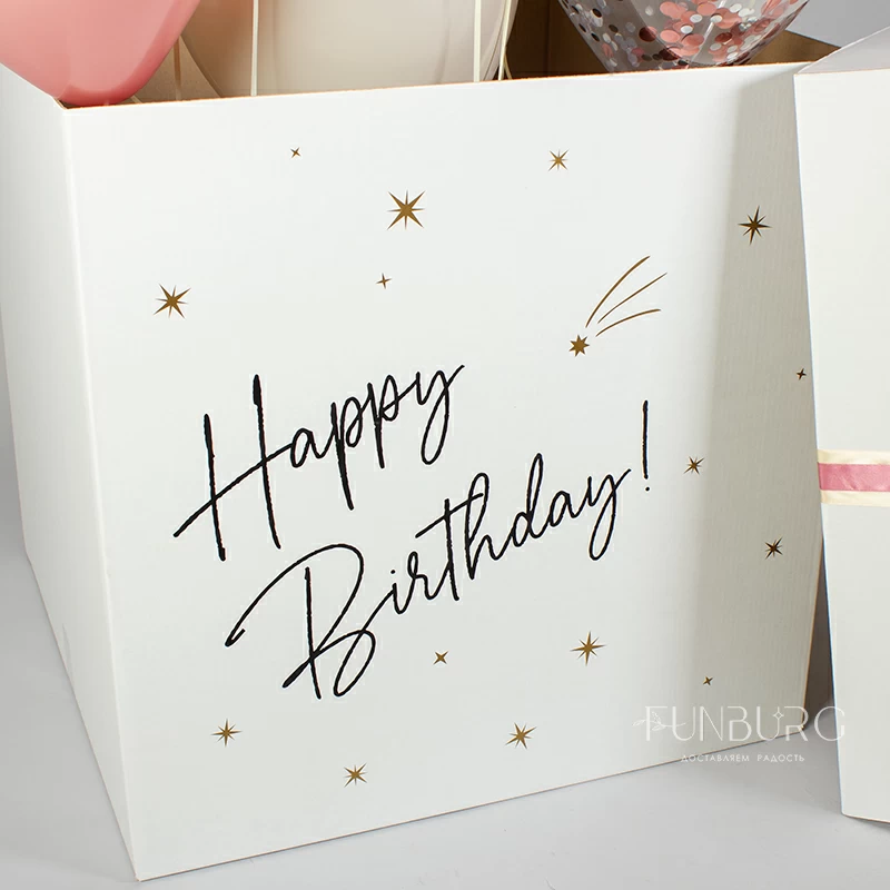Огромная коробка с шариками в пудровых, песочных и жемчужно-серых оттенках не только может служить подарком-сюрпризом сама по себе, но и станет красивой упаковкой для основного подарка: просто передайте нам подарок (он не должен быть большим), мы положим его на дно коробки и добавим шарики – когда получатель откроет крышку, шарики вылетят, а на дне коробки будет обнаружен заветный сюрприз! По вашему желанию надпись на коробке, а также цветовую гамму шариков мы можем изменить.