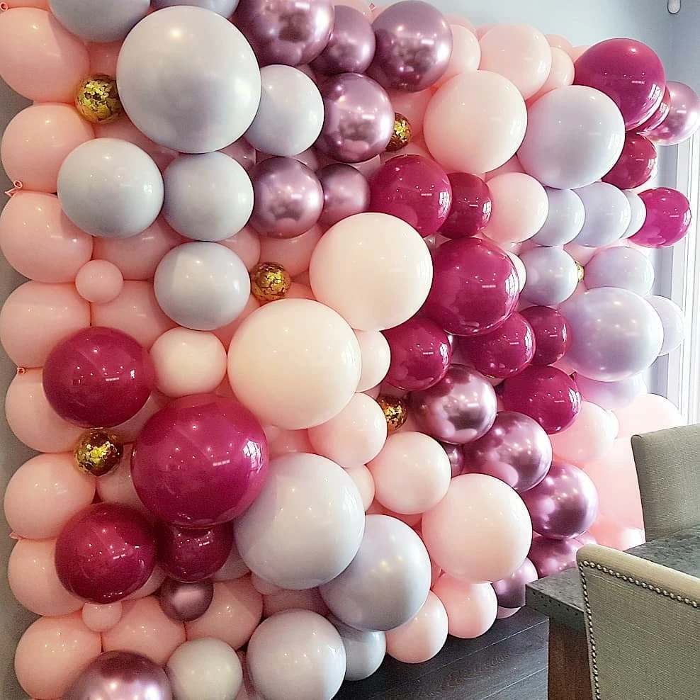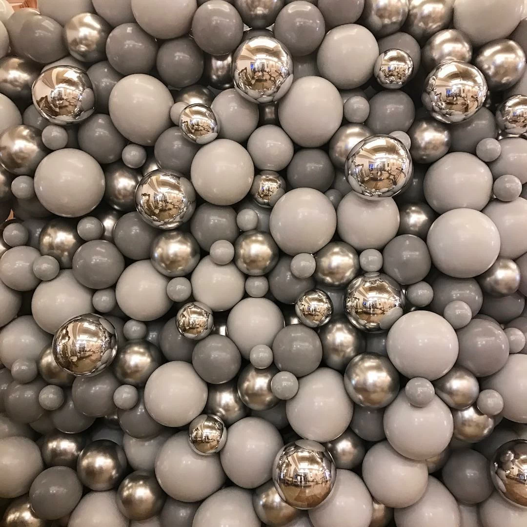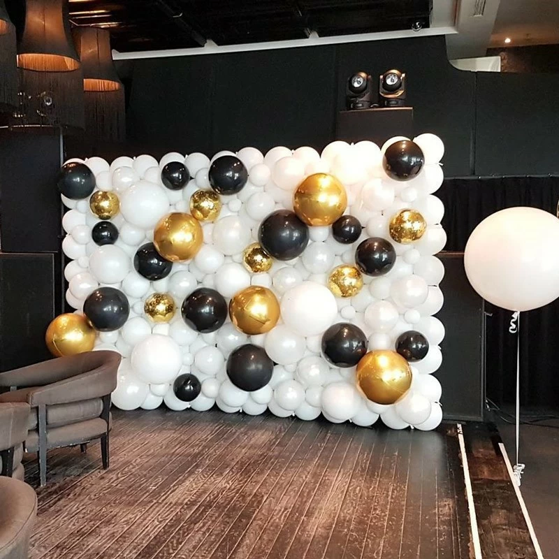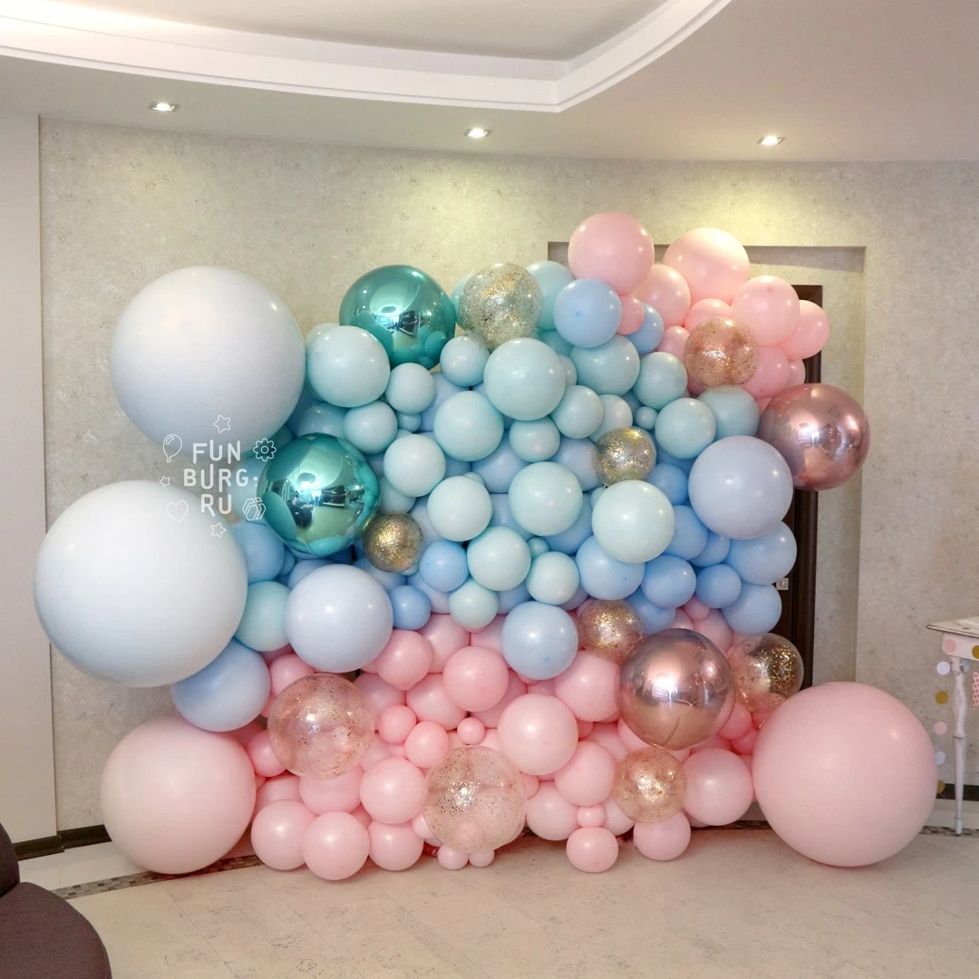 Разнокалиберная гирлянда-стена – красивый и необычный вариант декора воздушными шарами! Стена изготавливается из воздушных шаров разного диаметра. Это могут быть не только простые латексные шары, но и шары с конфетти, мраморные шарики, шары из фольги разной формы (звезды, сердца, круги, сферы, и т.д.). На фотографиях лишь пример подобной стены из разнокалиберных шариков, мы можем изготовить гирлянду любой сложности, любого размера и состава, индивидуально для вашего торжества, с учетом всех пожеланий и особенностей пространства.