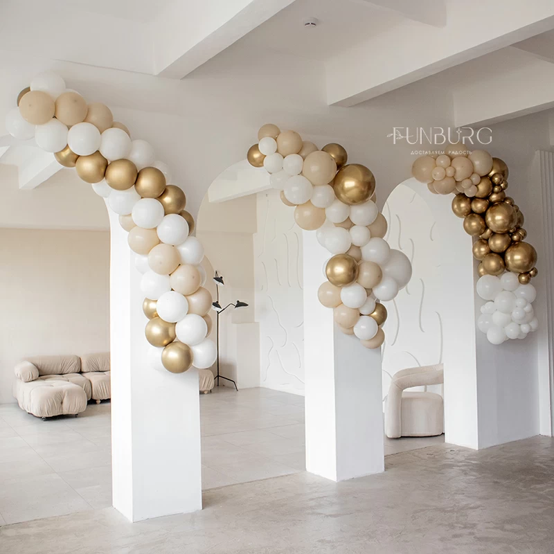 Форма гирлянды, ее диаметр также могут быть любыми: например, можно изготовить целую стену целиком из шариков разного калибра и сделать из нее фотозону! На фотографии лишь пример подобной гирлянды, но мы можем изготовить гирлянду любой сложности, любого размера и состава, индивидуально для вашего торжества, с учетом всех пожеланий и особенностей пространства.