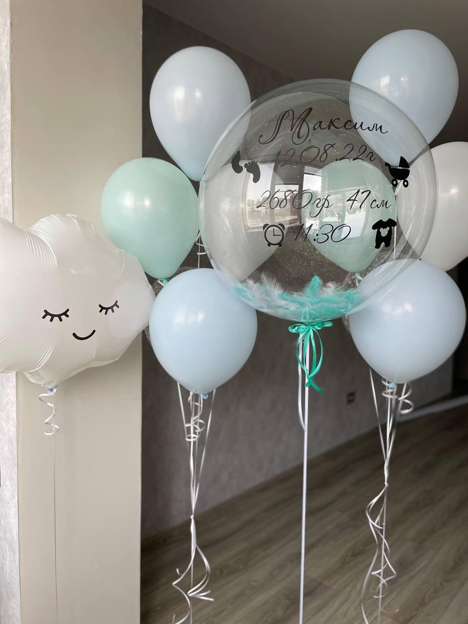 Шар баблс + голубые/белые перья + ваша надпись.