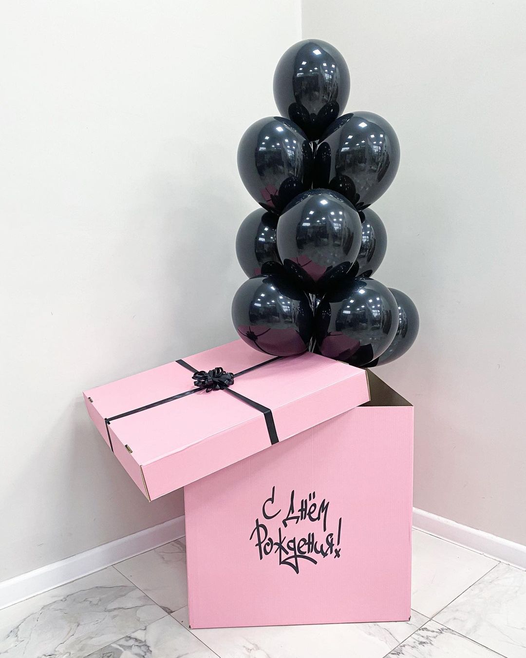 Розовая коробка с черными гелиевыми шарами