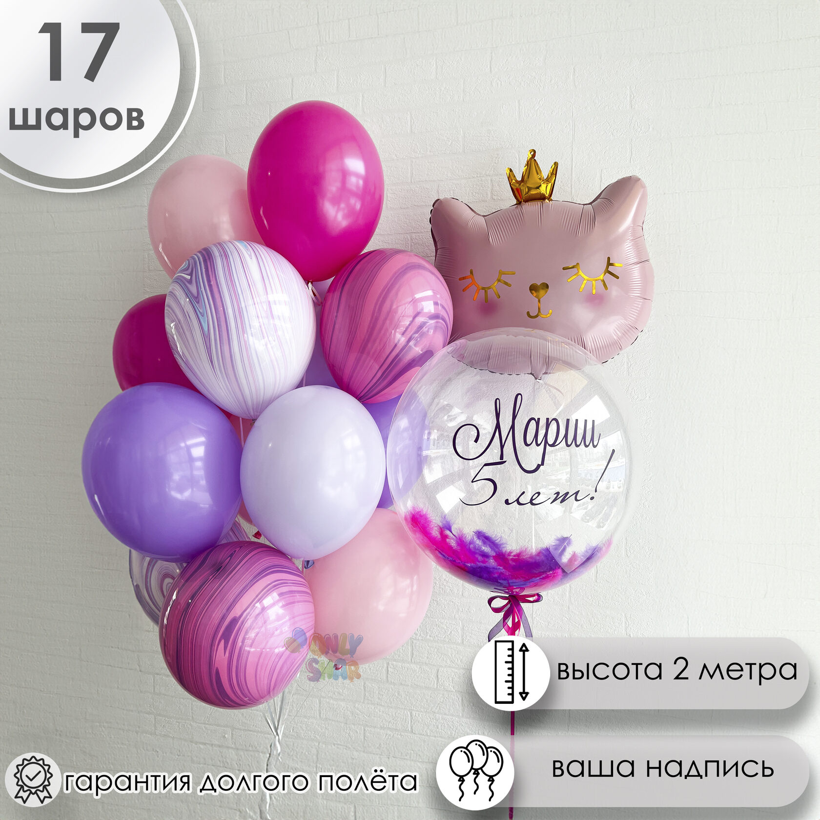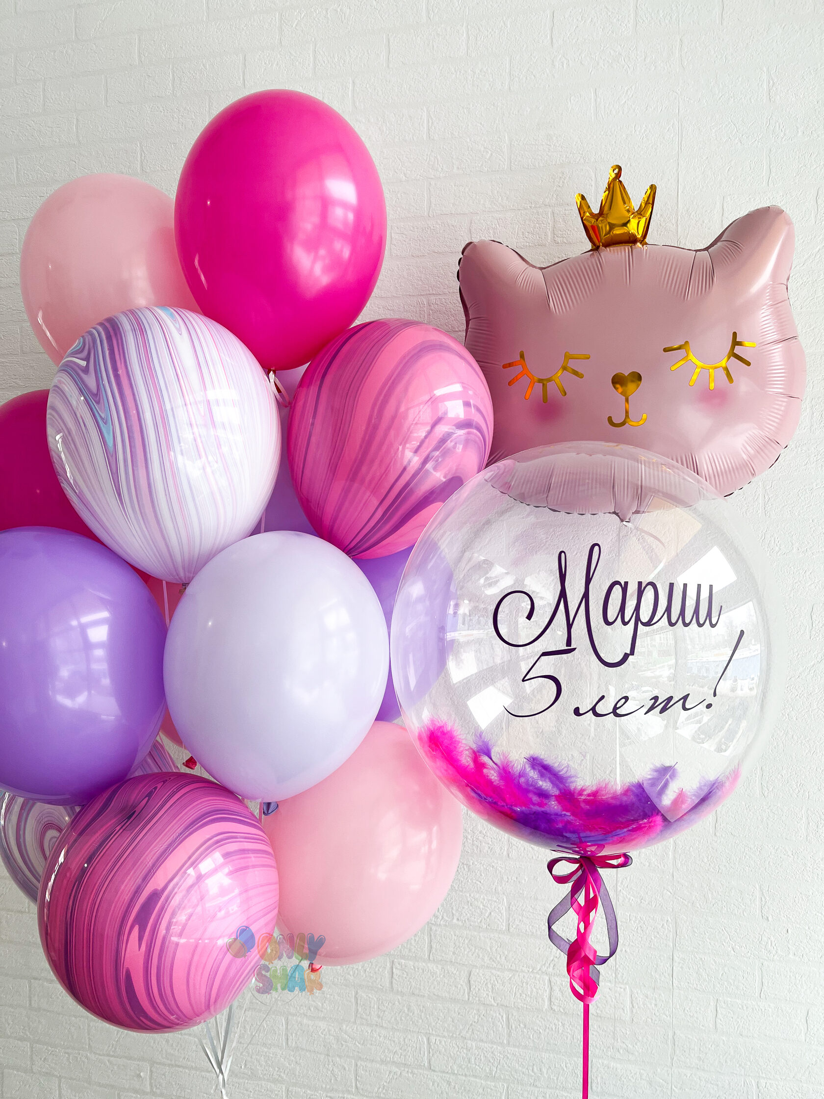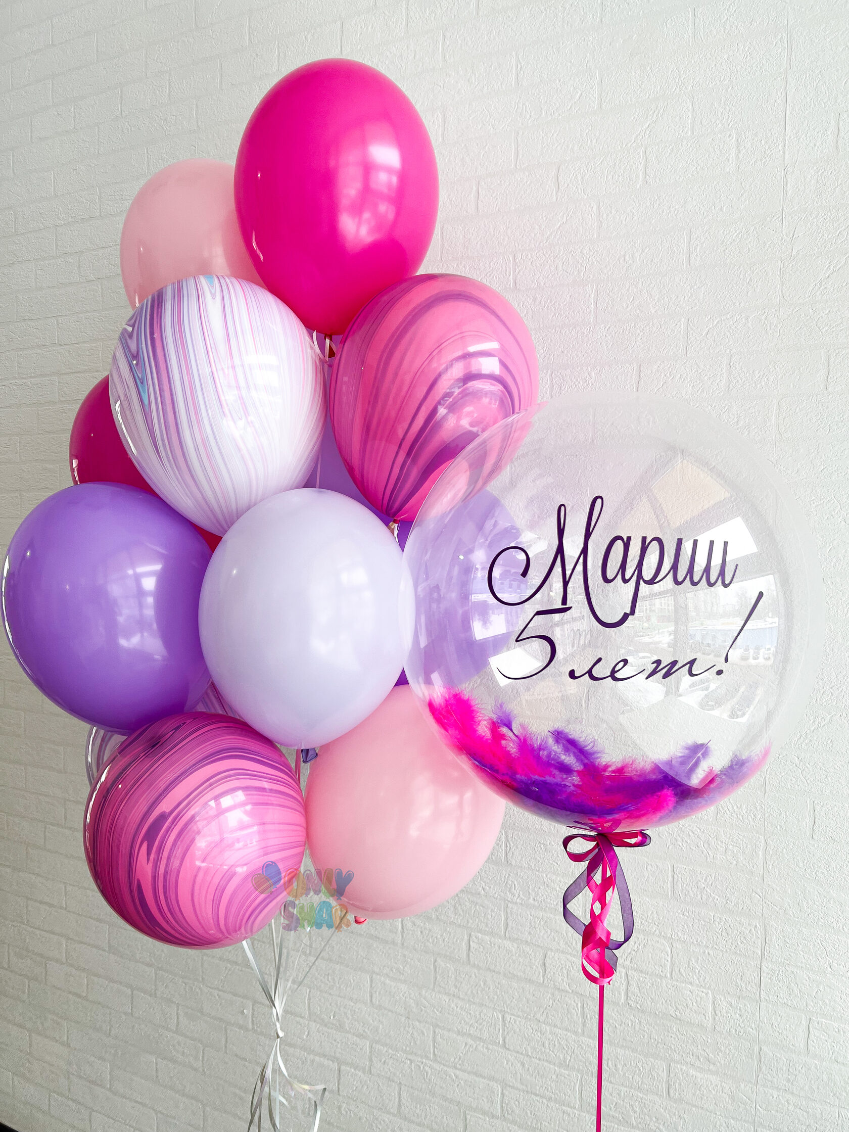 – Шар баблс с перьями (фуксия/фиолетовые) и с индивидуальной надписью