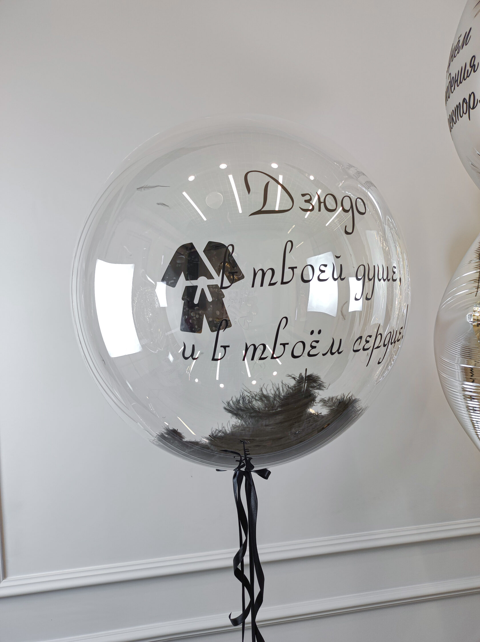Шар баблс + чёрные перья + 2х сторонняя надпись.