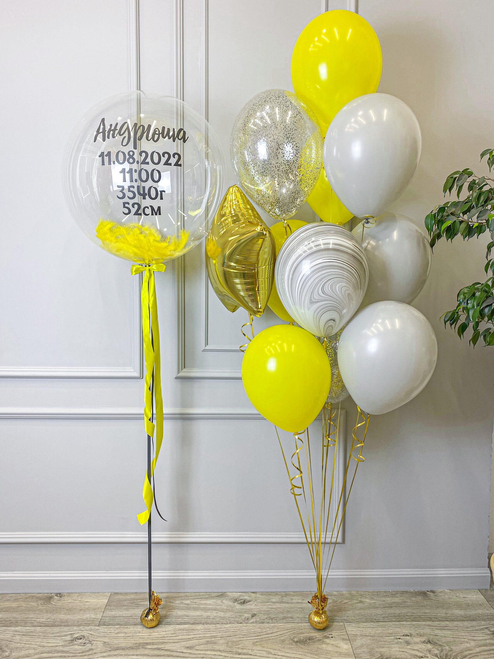 Шар баблс + жёлтые перья + ваша надпись.