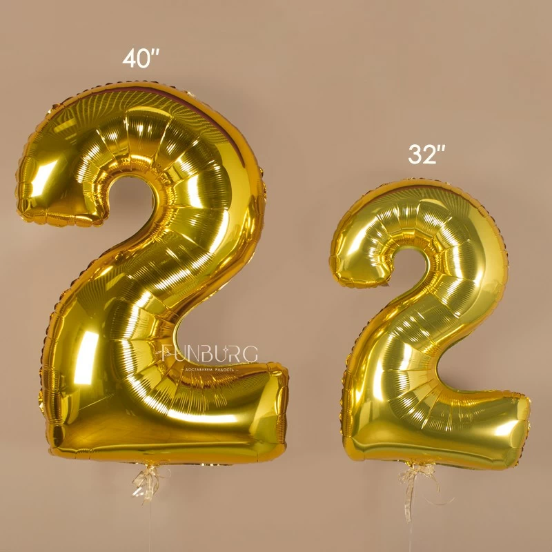 Цифры 32″ – мини-версия классических фольгированных цифр 40″ (102 см). Они такой же формы, такого же цвета, но заметно меньшего размера, чем их старшие братья, – вторая фотография помогает понять эту разницу. Зато у них свои преимущества: они заметно дешевле, гармонично смотрятся в фонтанах из шаров (не закрывают остальные шарики, как иногда происходит с большими цифрами), и их даже можно поместить в коробку с шариками.