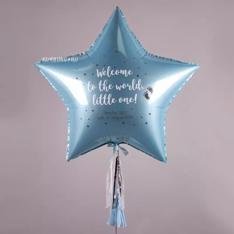 Огромная звезда (ее диаметр почти 1 метр!) из фольги с кисточками и оригинальной надписью – красивый и необычный способ поздравить и порадовать самых дорогих людей! Например, такая сможет стать украшением дома к встрече мамы и малыша: на нем можно написать дату, время рождения, имя ребенка и все, что пожелаете!