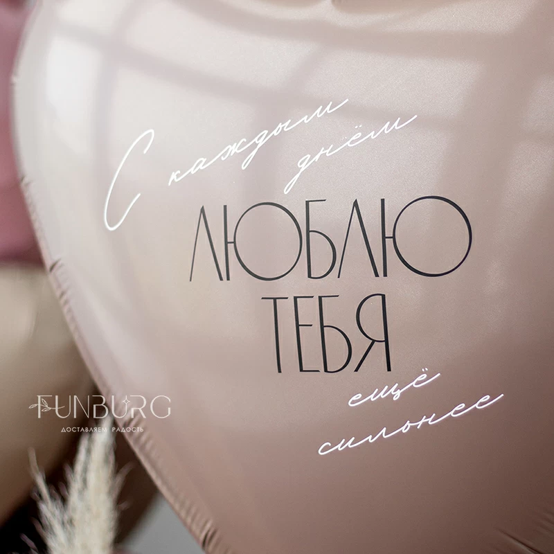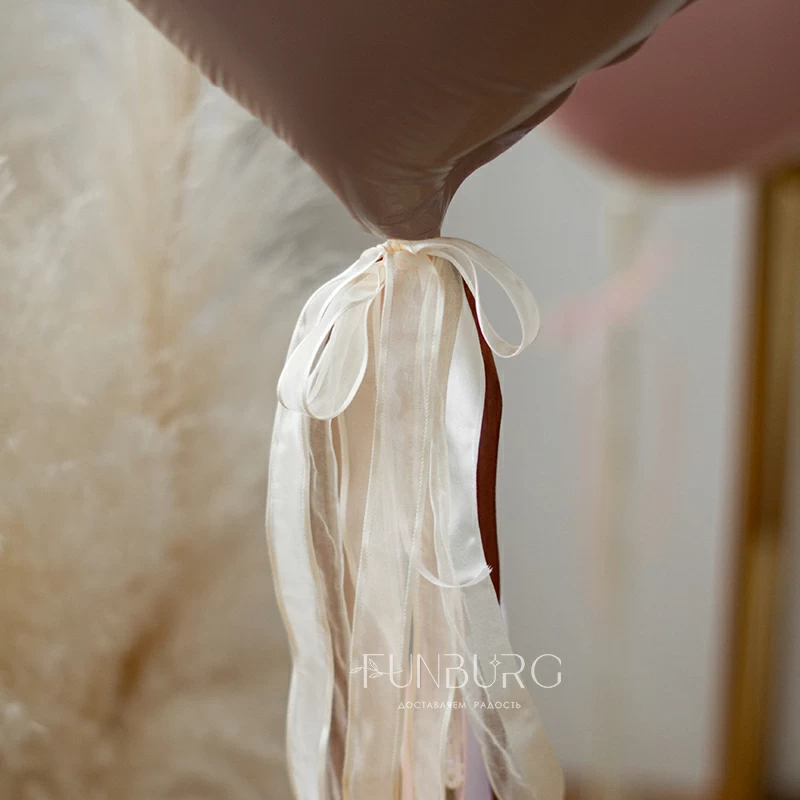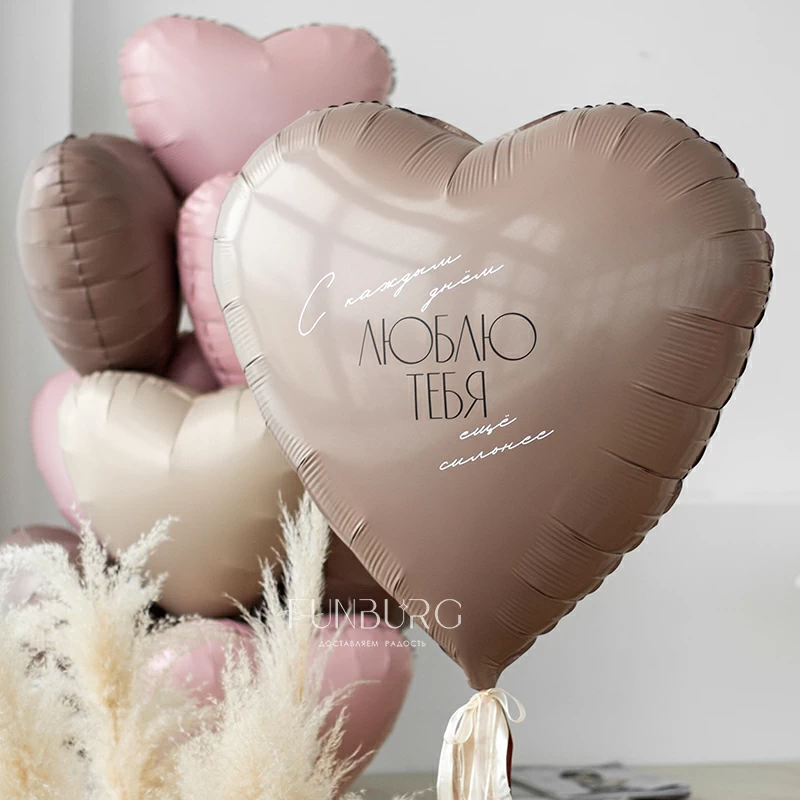Большое матовое сердце нежного кофейного оттенка будто создано для самых теплых слов и пожеланий! Шарик мы декорировали шлейфом из лент разных оттенков и текстур и романтичной надписью для самого любимого человека.