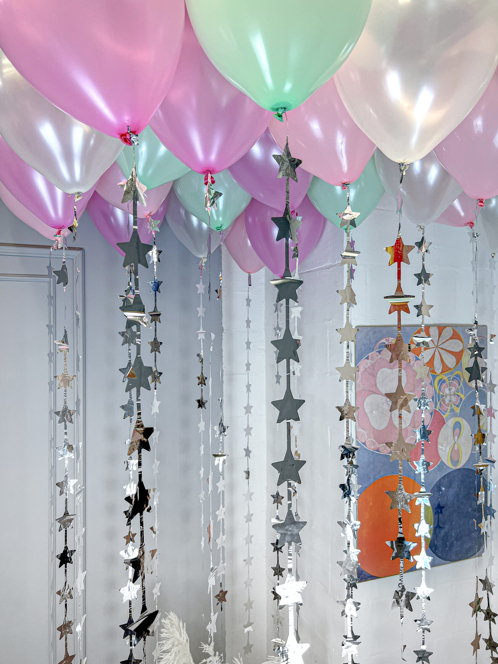 Шары для девочки под потолок с дождиком в виде звёзд