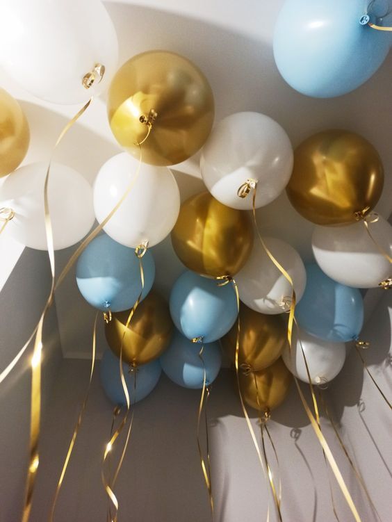 Шары под потолок 30 штук: белые, голубые и золото хром