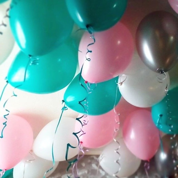 Шары в голубом, белом и розовом цвете с атласной лентой