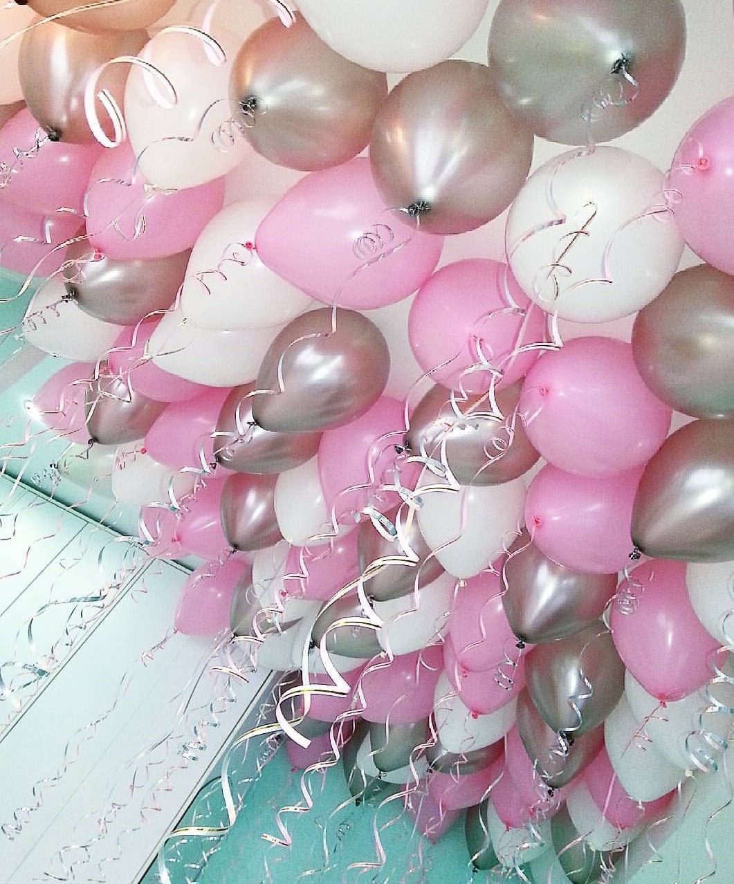 Шары в голубом, белом и розовом цвете с атласной лентой