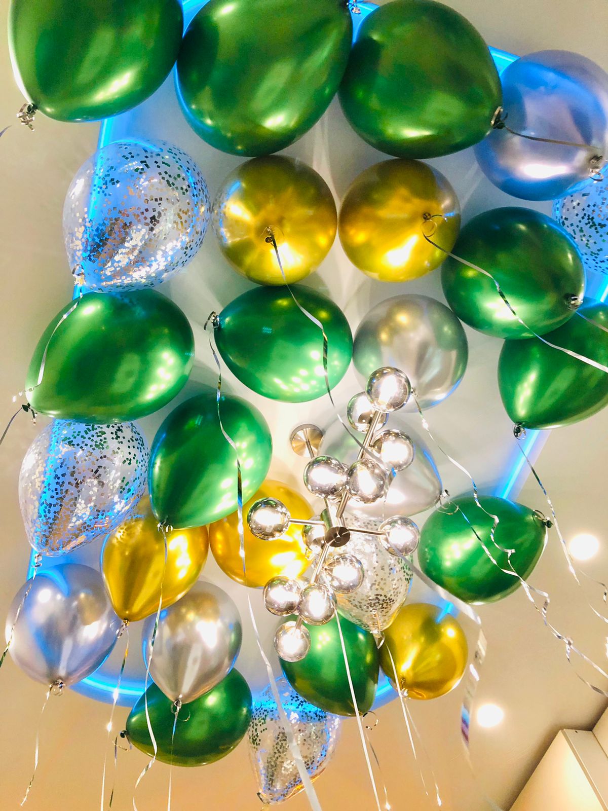 Шары под потолок Хром: cеребро, зелёный, золото, конфетти серебро