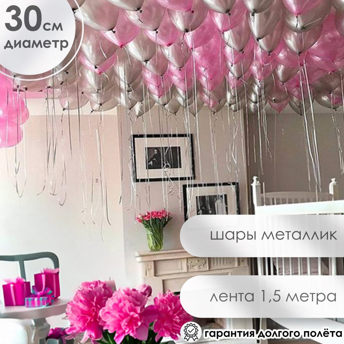 Шары под потолок металлик: серебро, розовый 50 штук