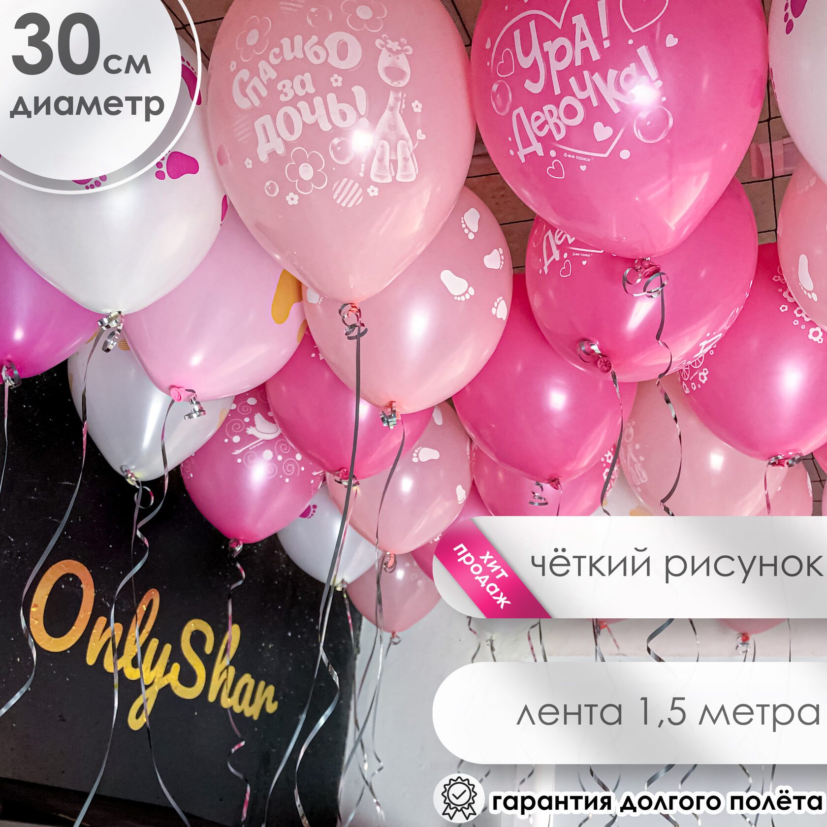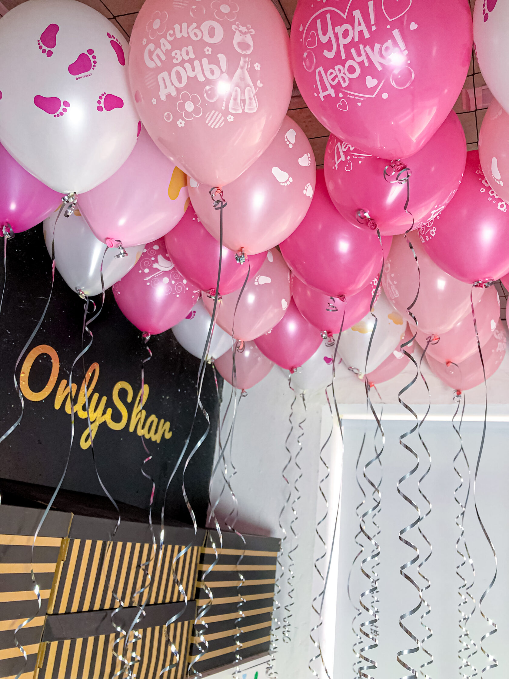 Шары в голубом, белом и розовом цвете с атласной лентой