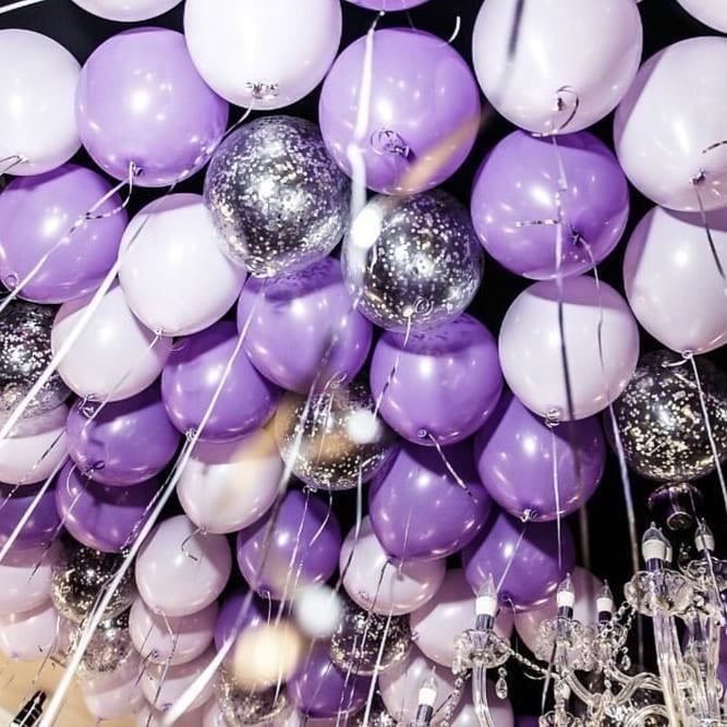 Шары под потолок: нежно-сиреневые, сиреневые, конфетти серебро