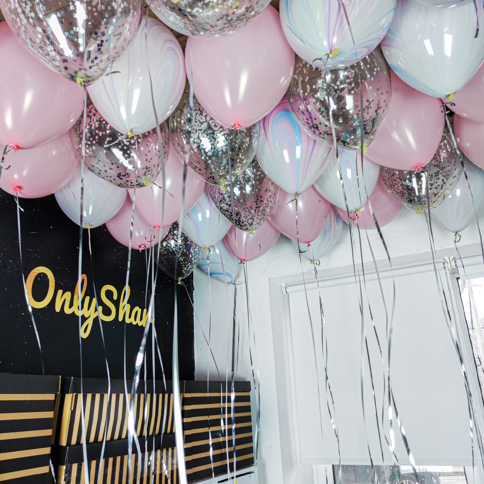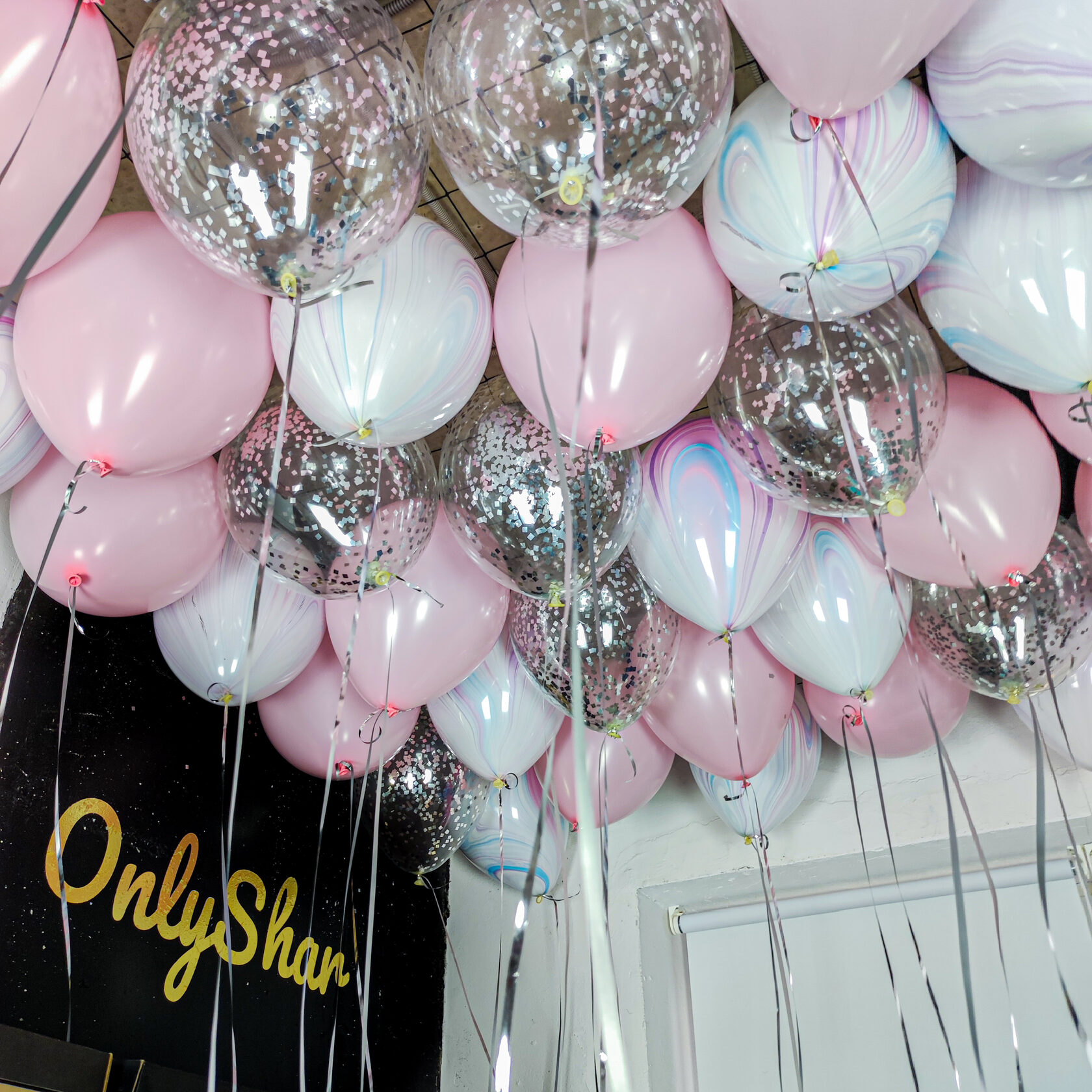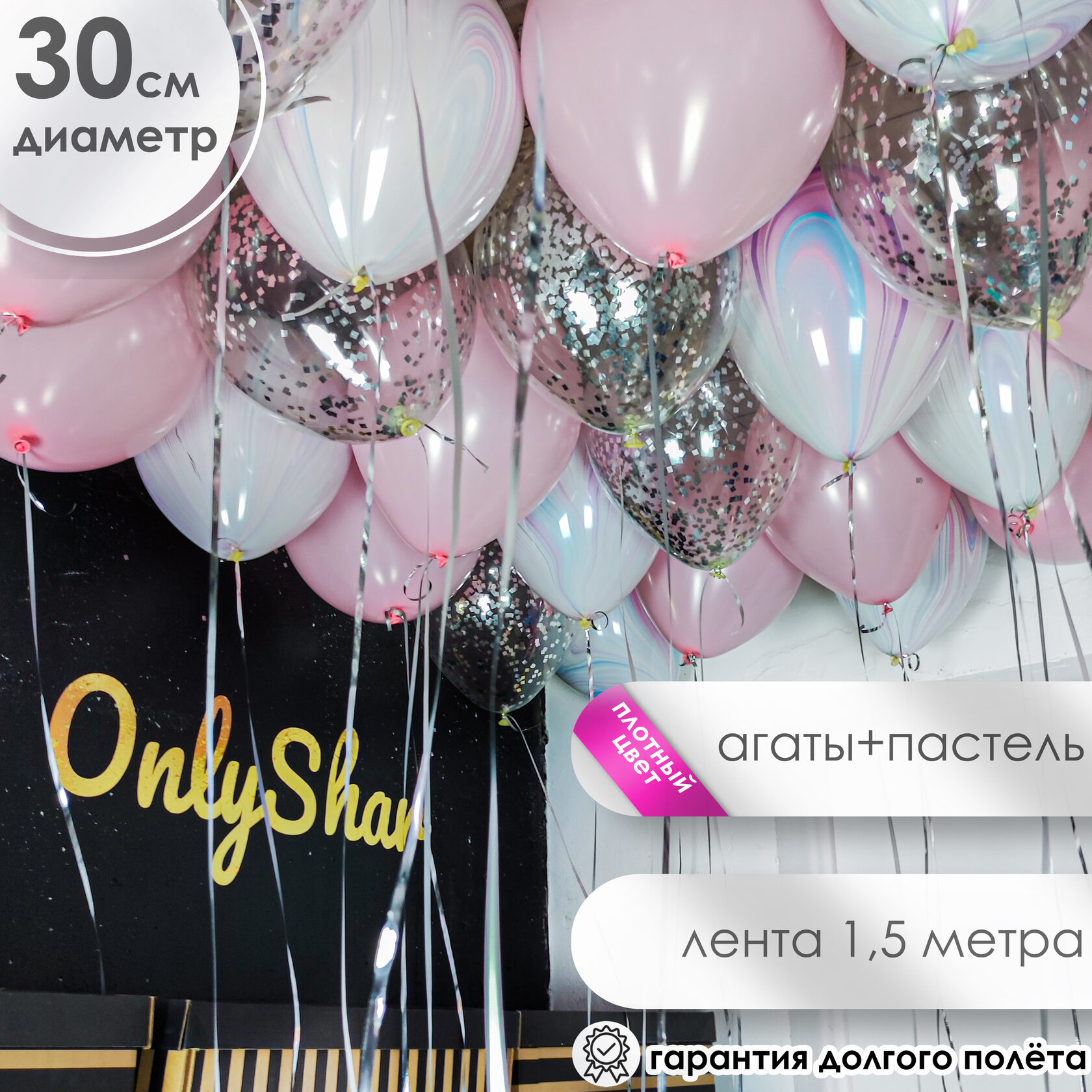 Шары под потолок: розовый, конфетти серебро, агат fashion