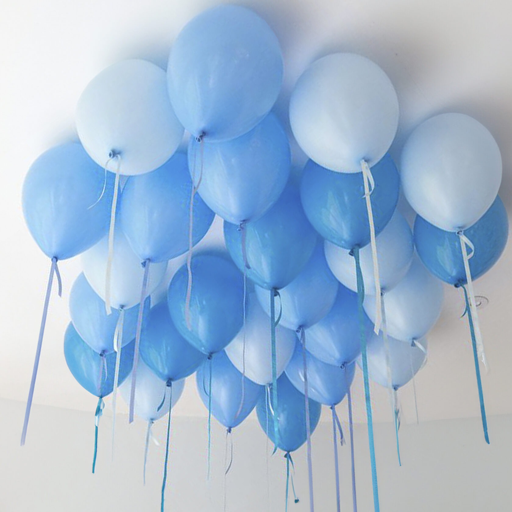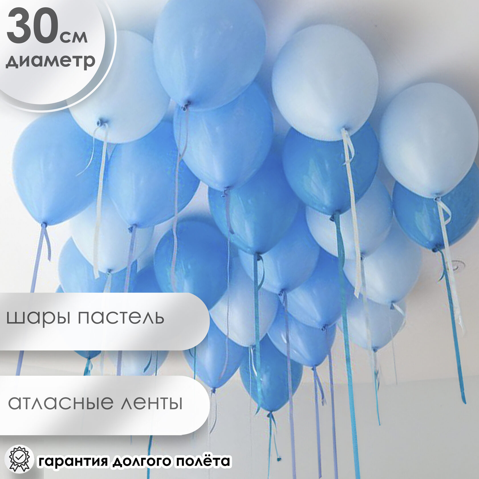 Шары под потолок с атласными лентами: голубой макарунс, голубой пастель
