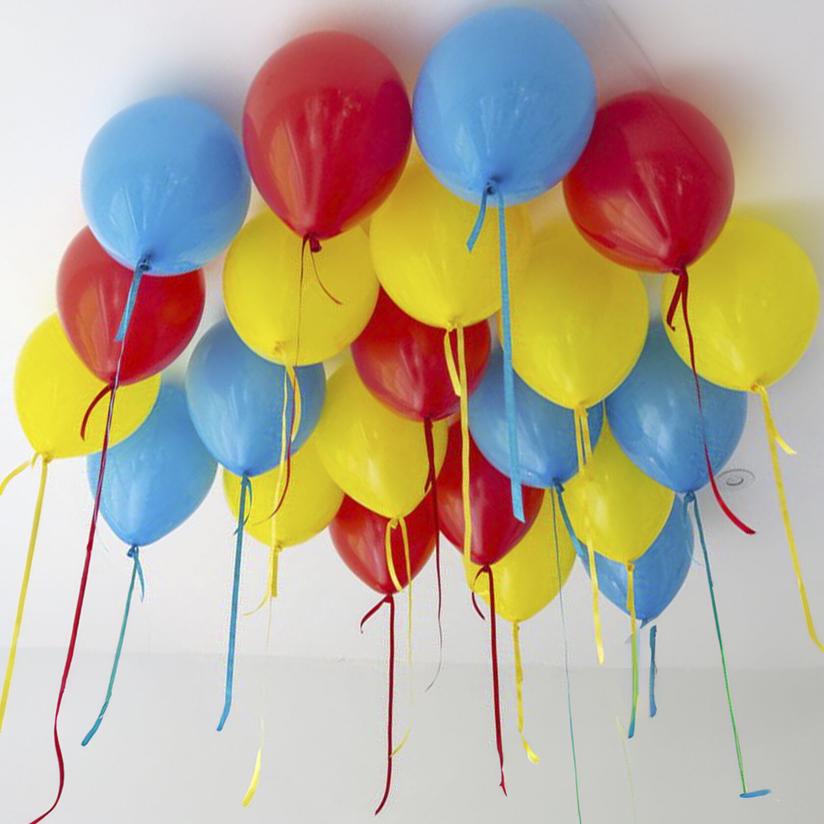 Шары под потолок с атласными лентами: голубые, красные, желтые