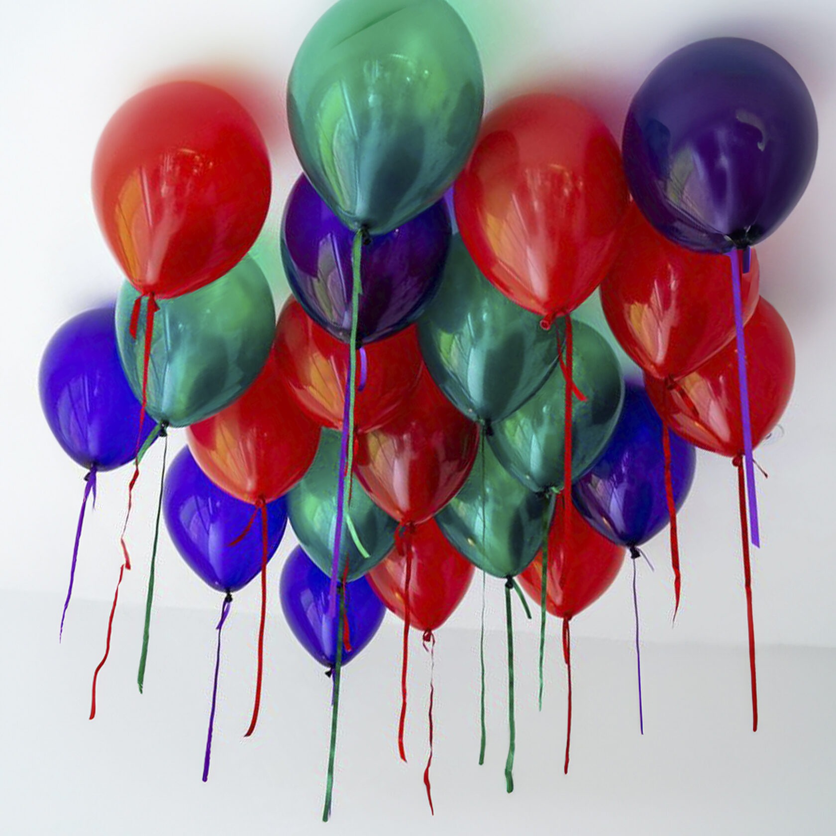 Шары под потолок с атласными лентами: зеленый кристалл, красный кристалл, фиолетовый кристалл
