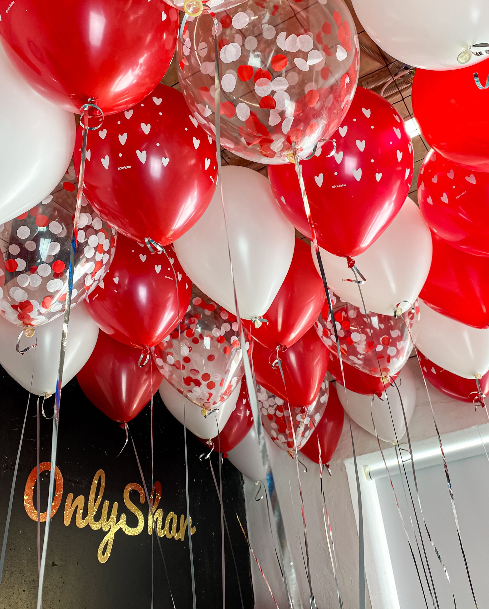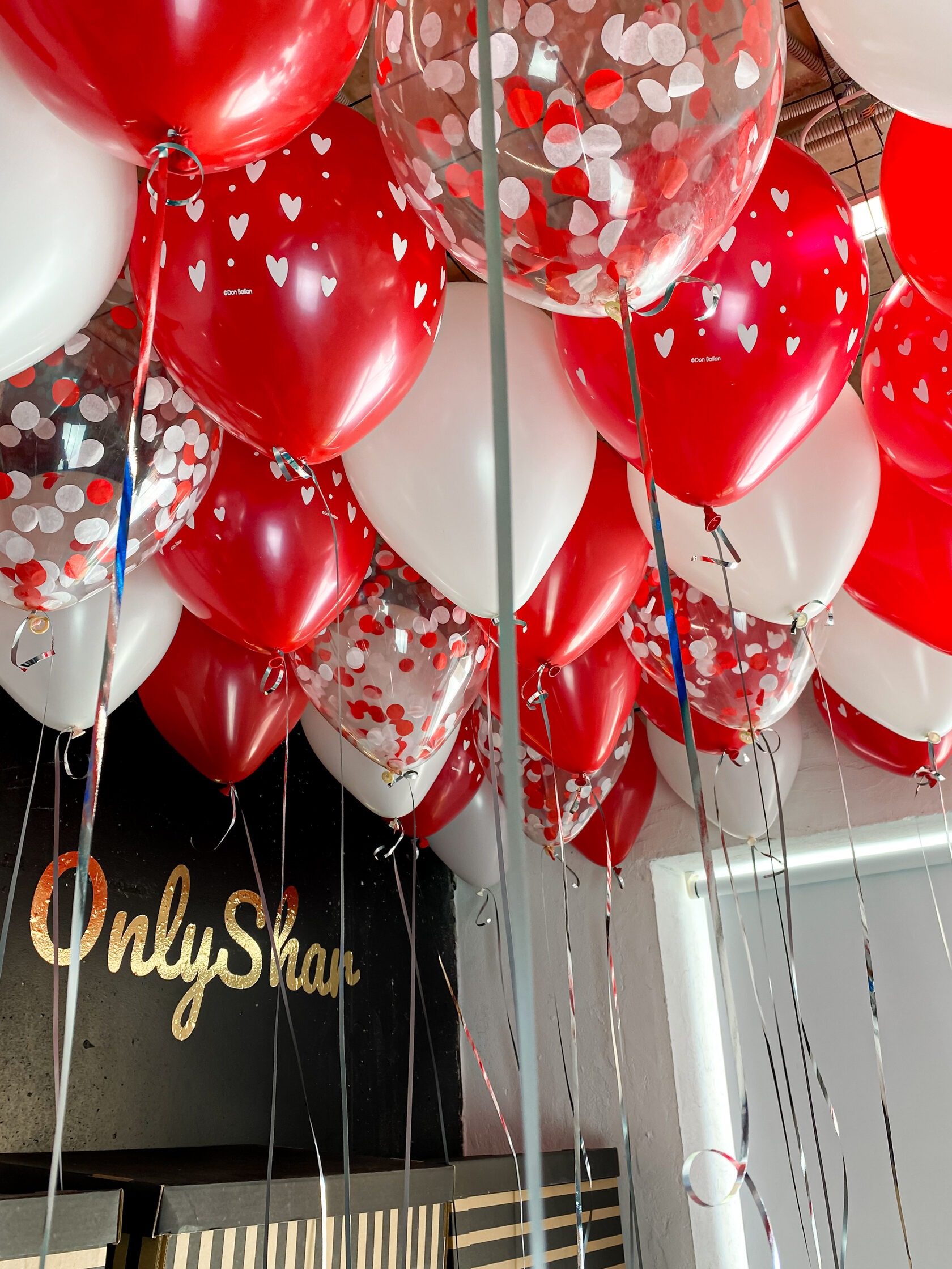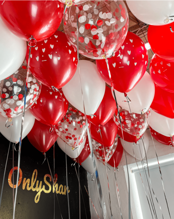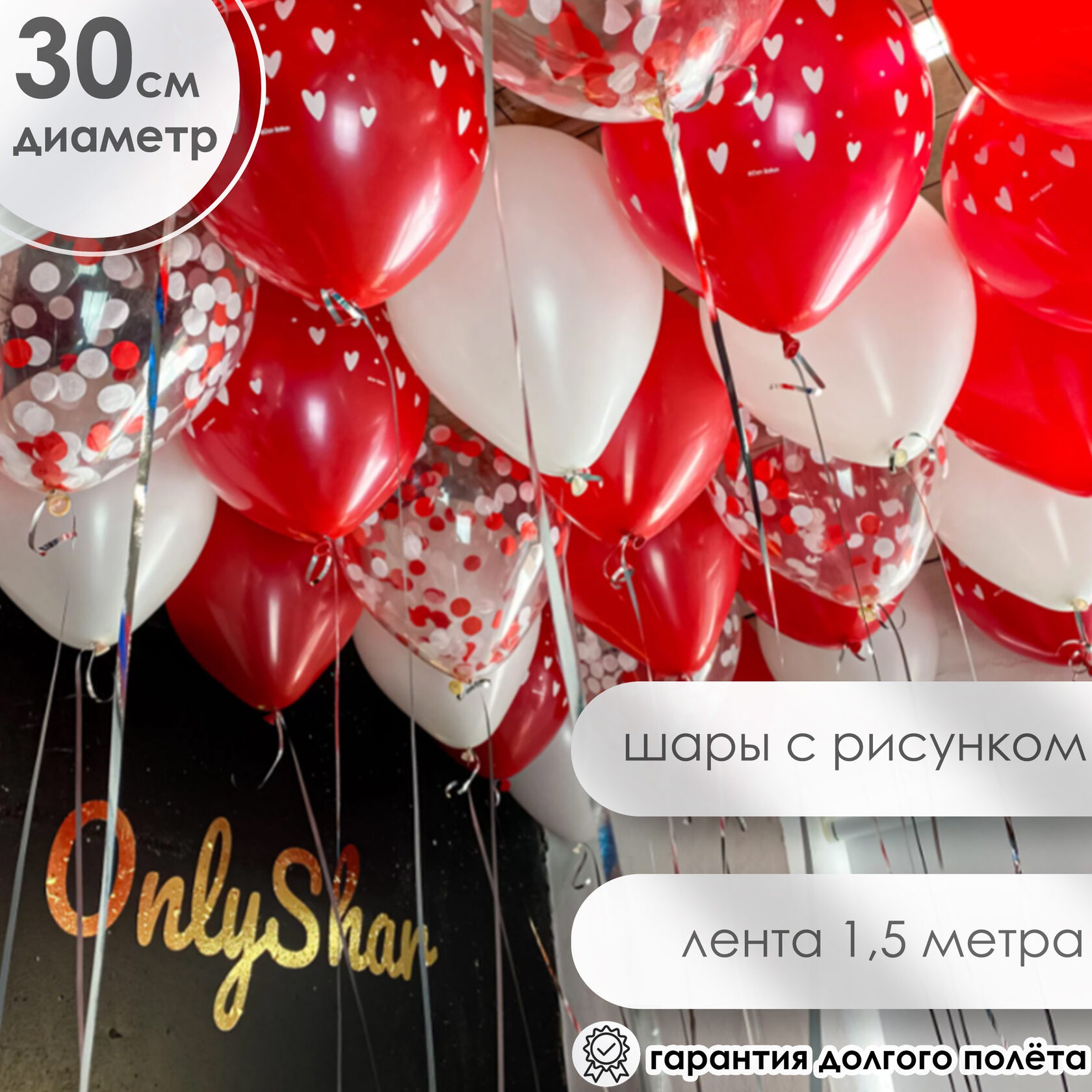 Шары под потолок: с рисунком “сердца”, белые, конфетти белый и красный