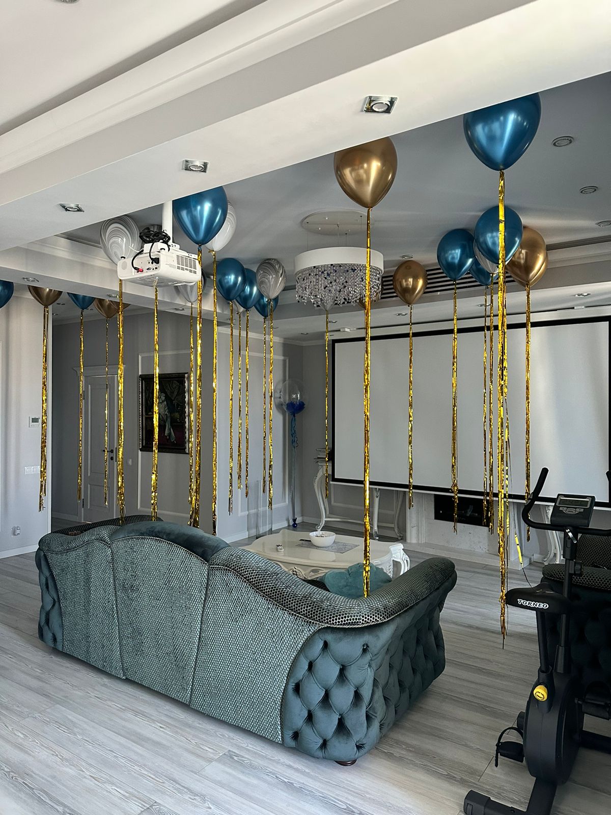 Шары под потолок: синий хром, конфетти серебро