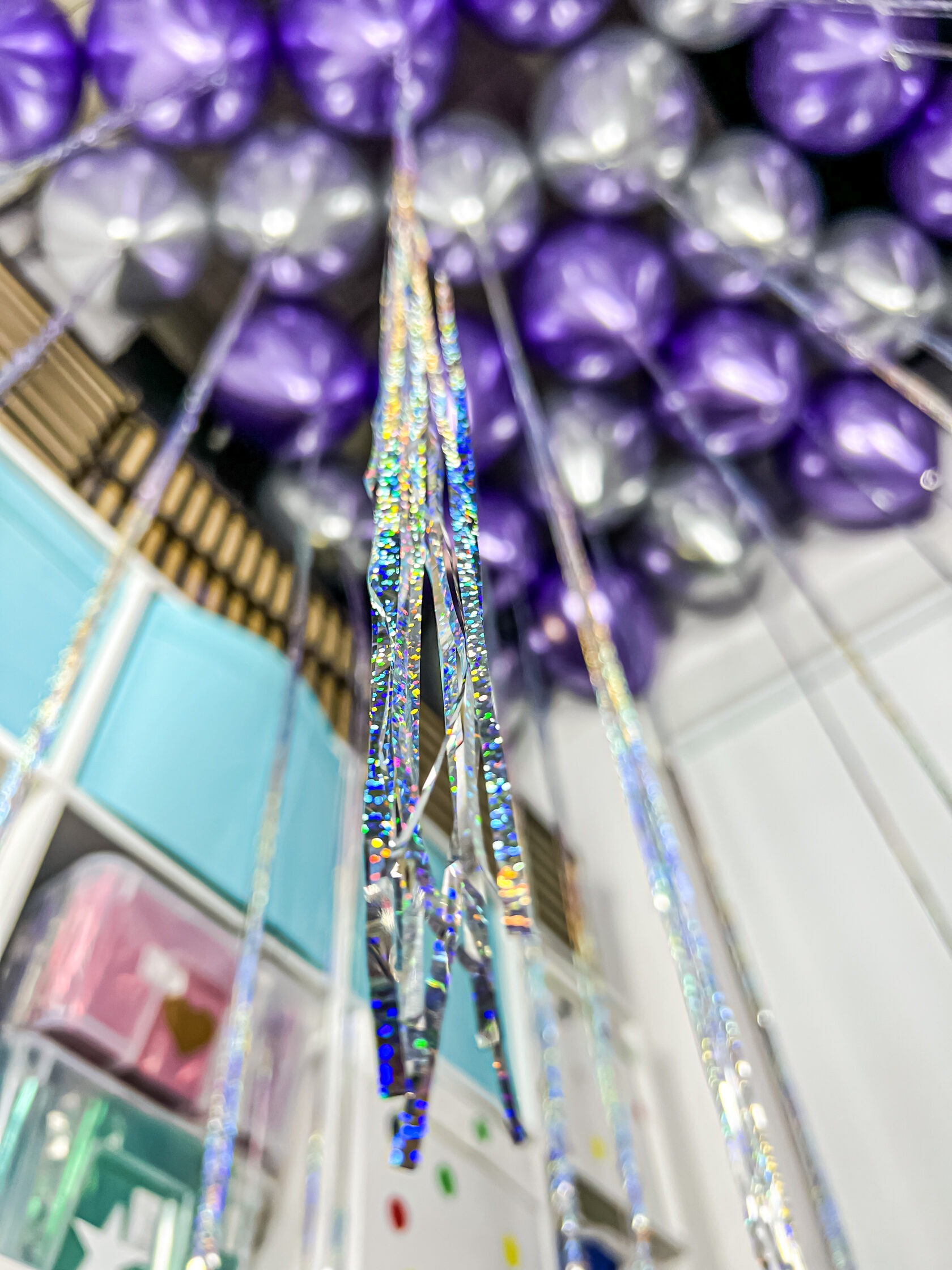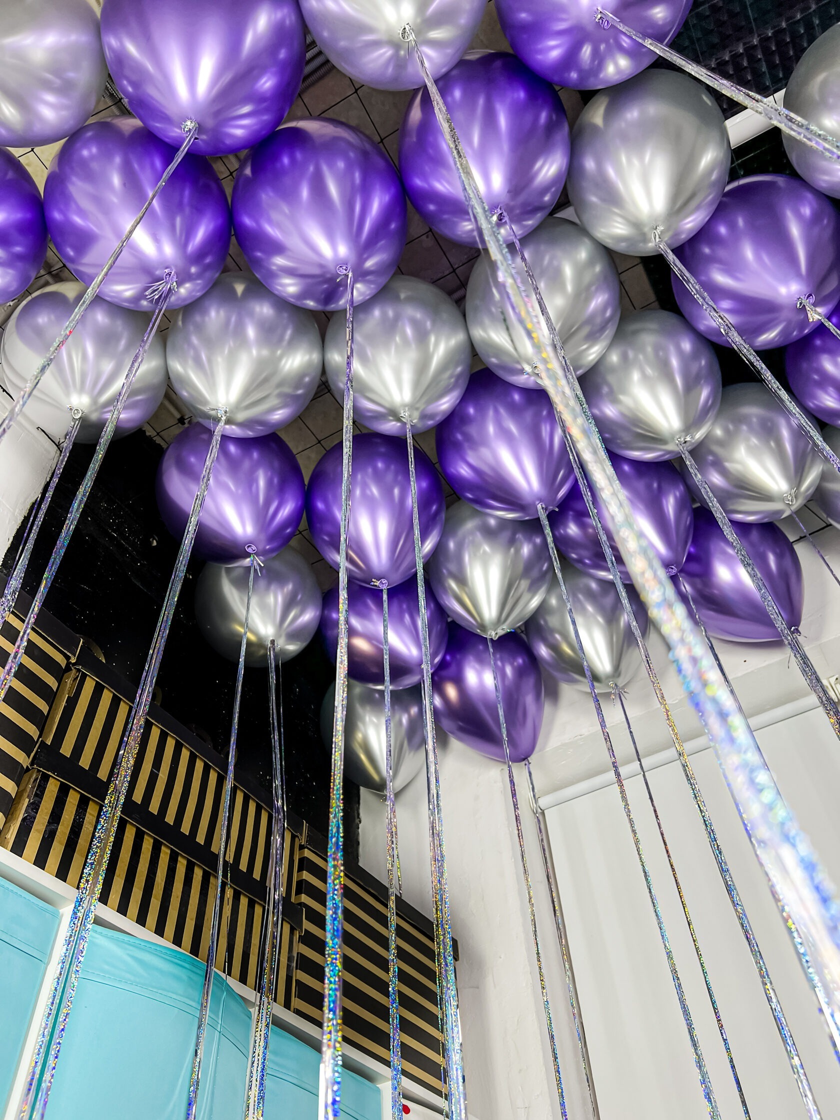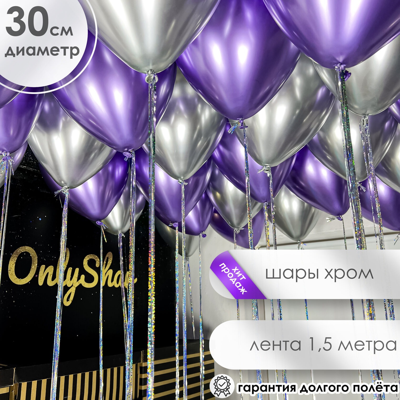 Шары под потолок: сиреневый хром и серебро хром с дождиком серебро