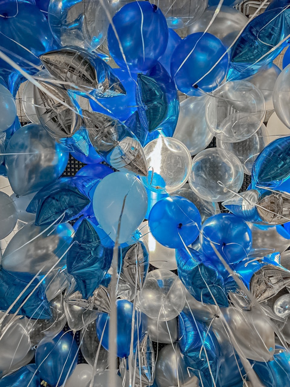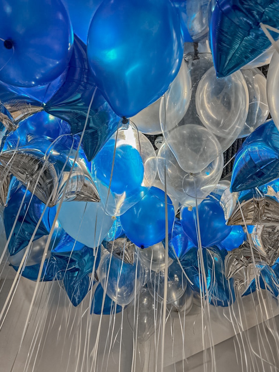 Шары в голубом, белом и розовом цвете с атласной лентой