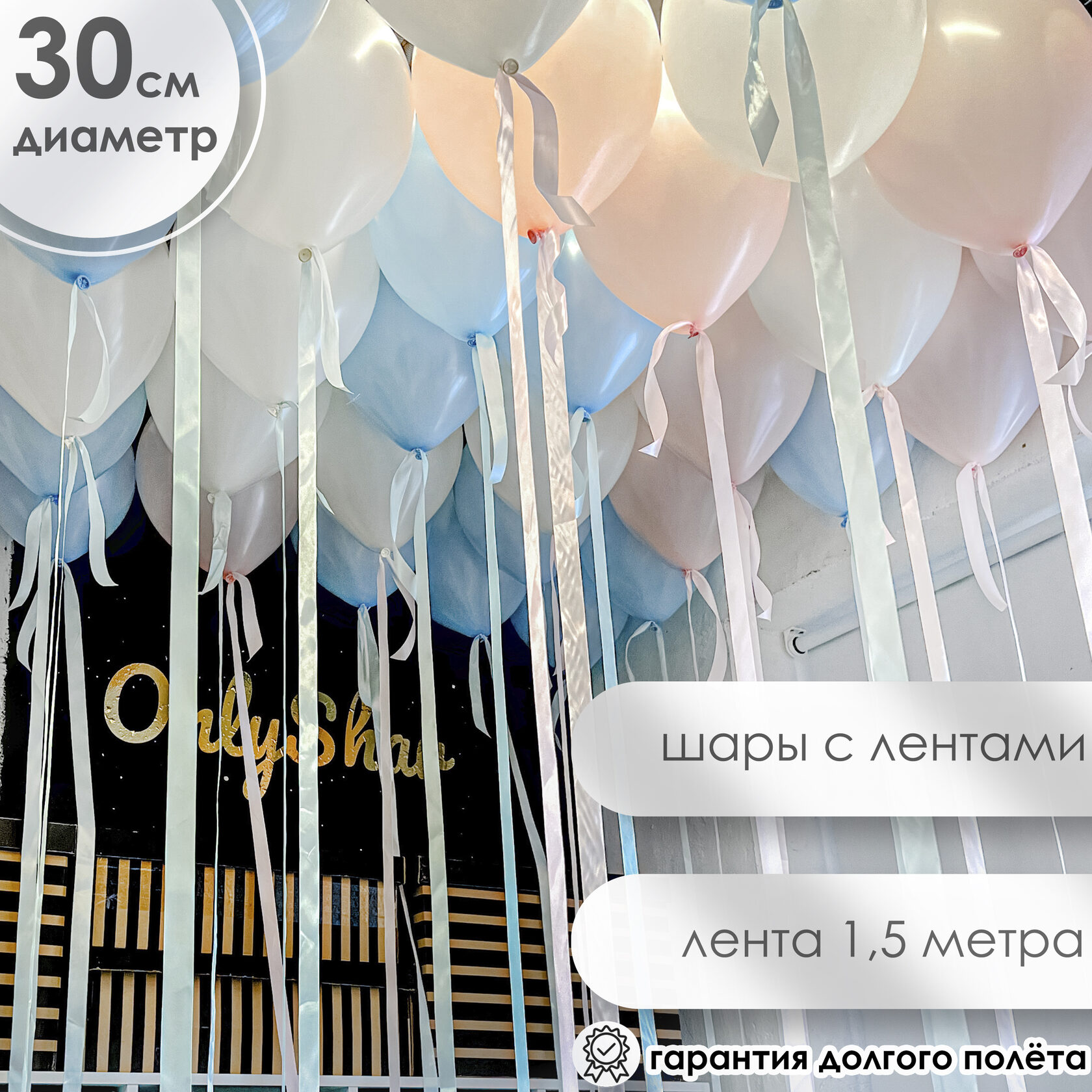 Шары в голубом, белом и розовом цвете с атласной лентой