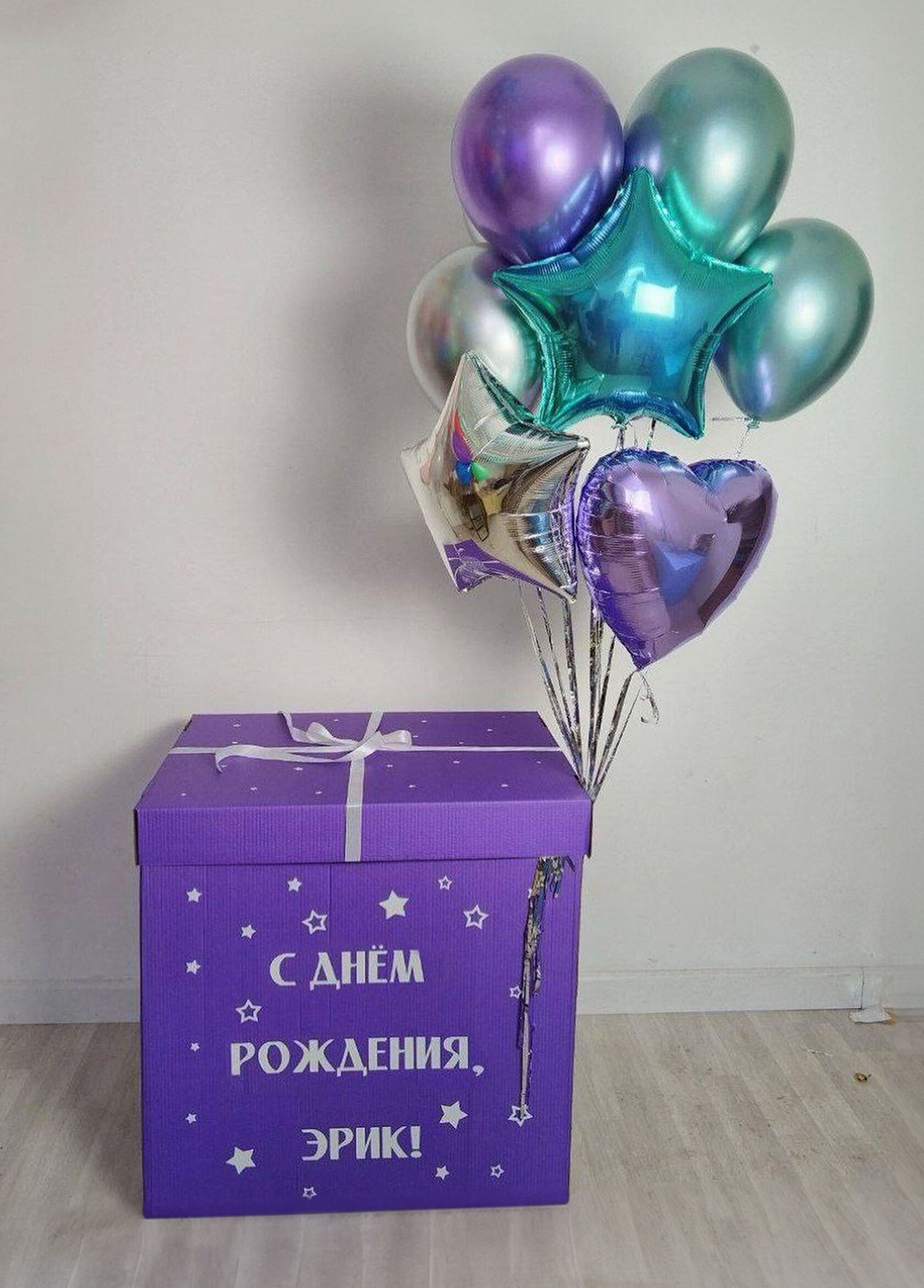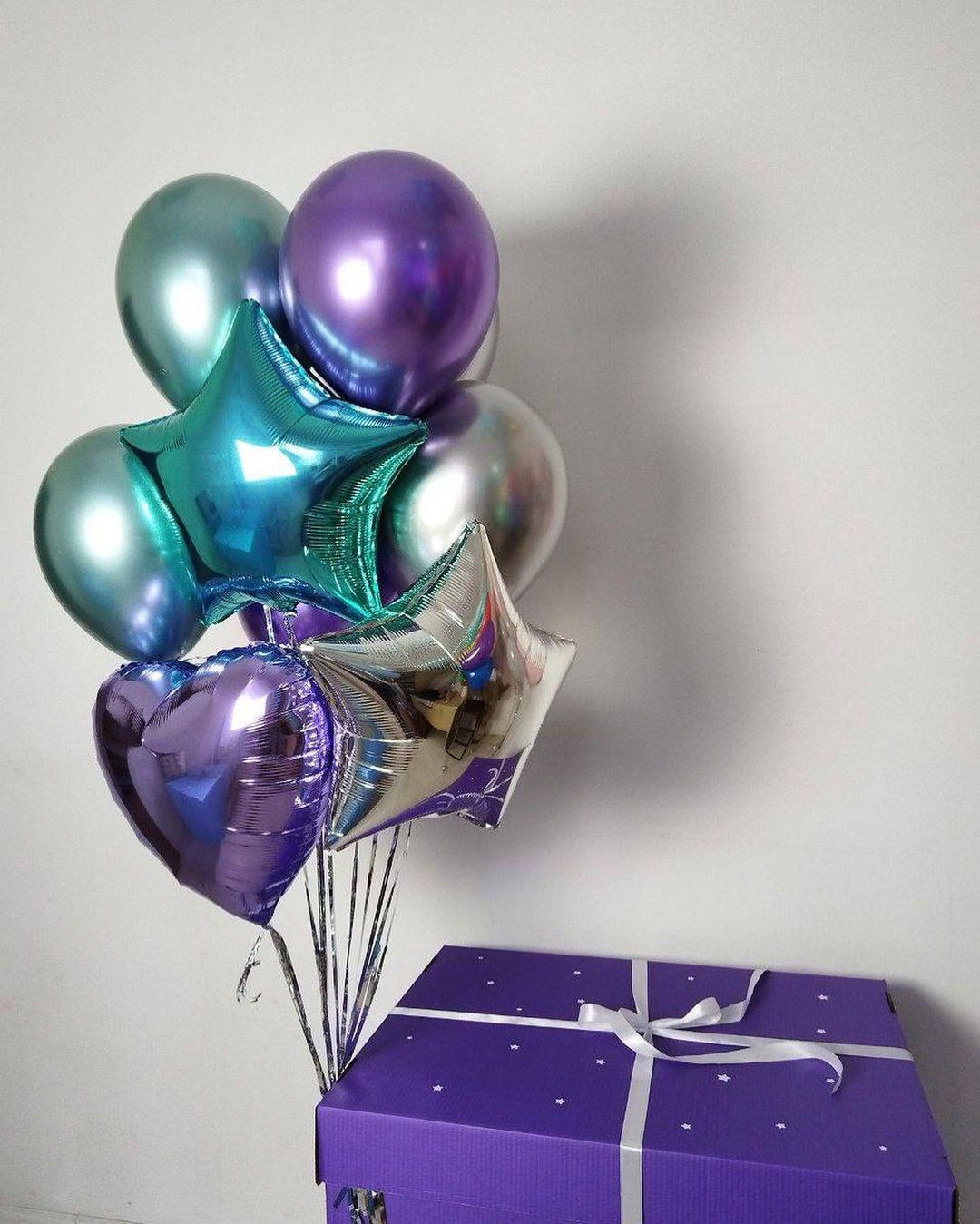 Шары в коробке для женщины в фиолетовом и бирюзовом цвете