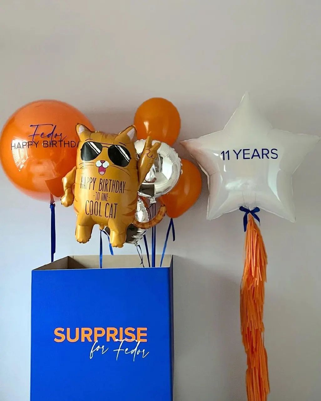 Синяя коробка-сюрприз с шарами в оранжевом цвете на день рождения