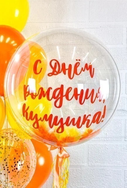 Шар баблс + оранжевые/жёлтые перья + ваша надпись.