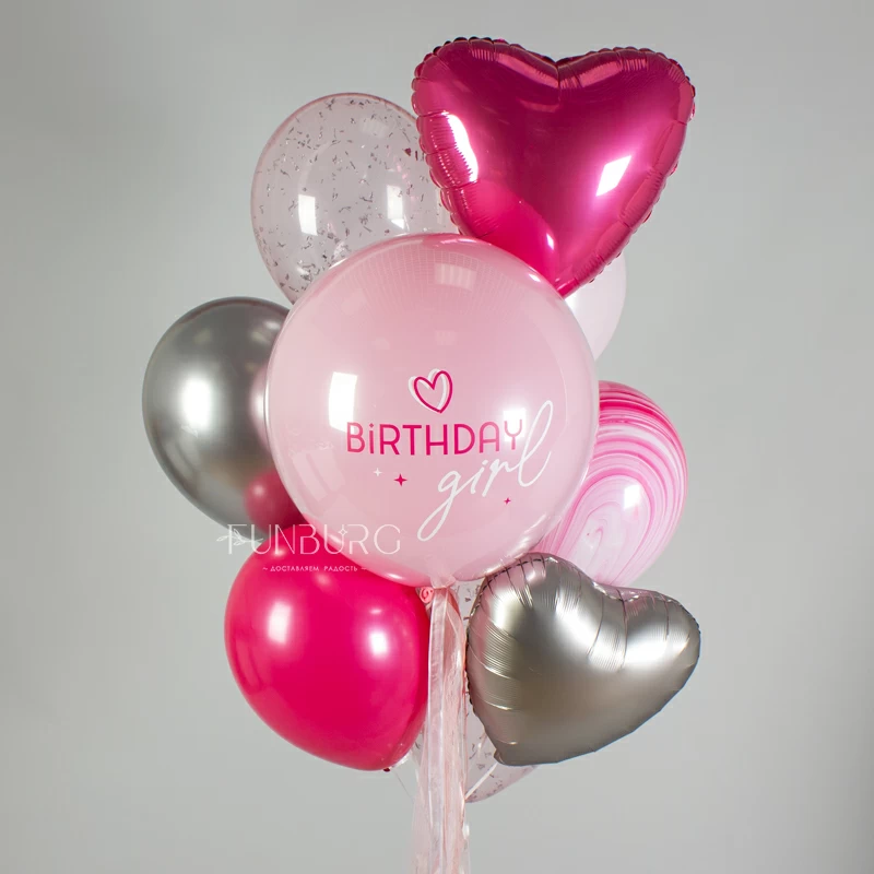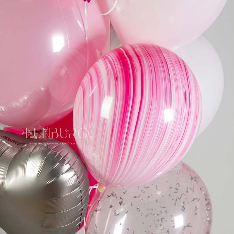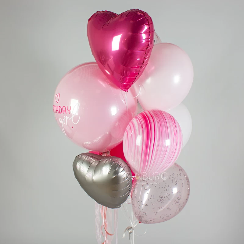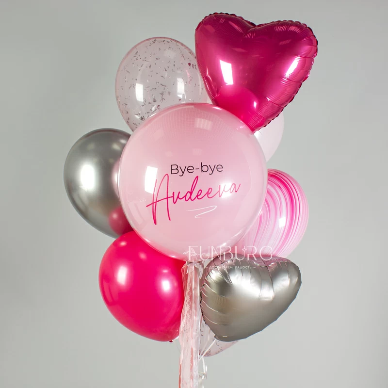 В этой связке всего 10 шаров разных размеров и фактур (5 латексных, 2 шарика с конфетти, 2 сердечка и большой глянцевый шар с надписью), перевязанных для завершенности и целостности лентой у основания, но все эти шарики подобраны так, что ни убрать, ни добавить ничего просто не хочется!