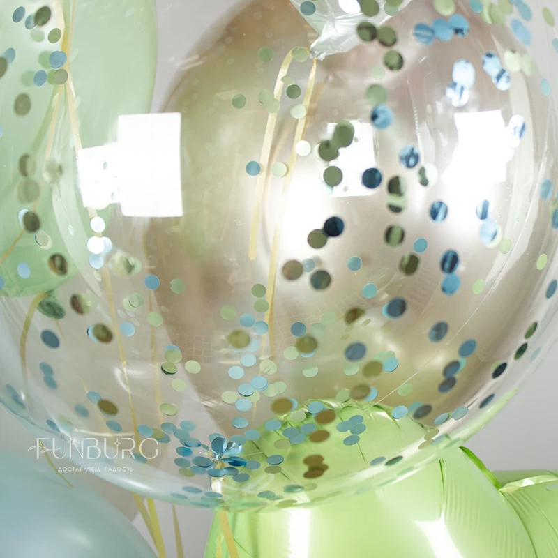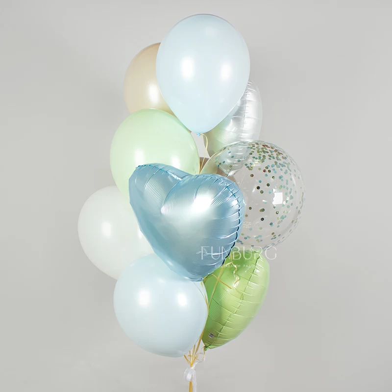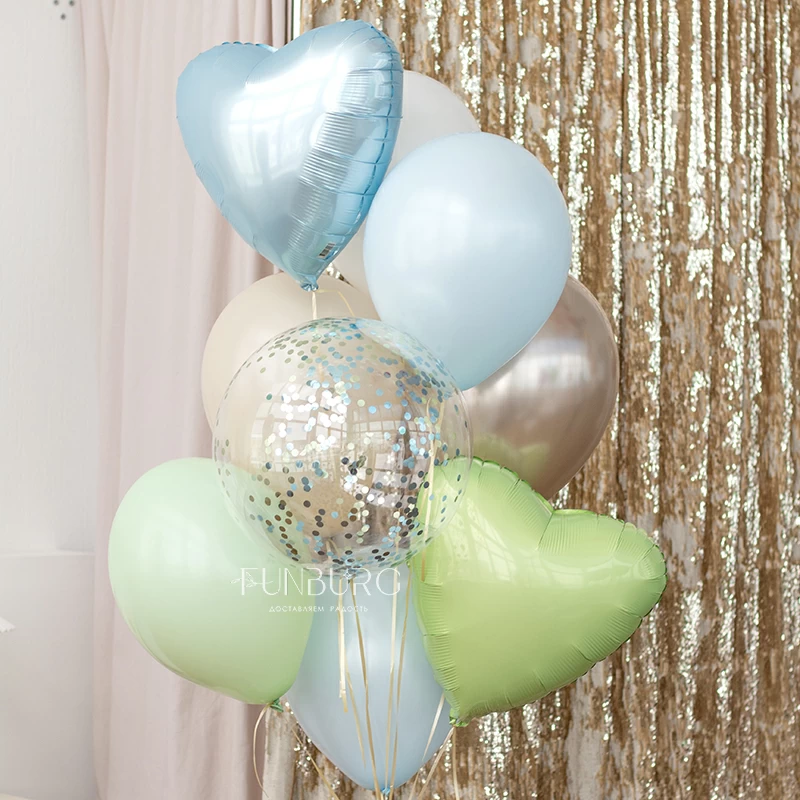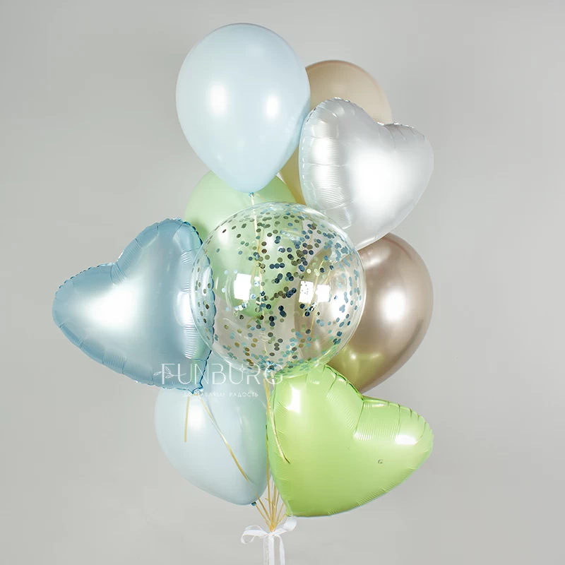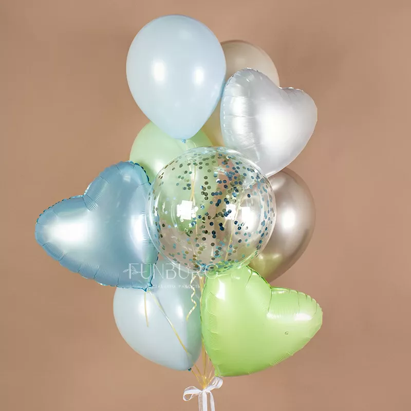 Простой и очень стильный вариант подарка или украшения праздника! Лаконичная небольшая связка шариков с сердечками, сверкающим прозрачным шаром Bubble с конфетти, перевязанная лентой. Нежные свежие оттенки идеальны для весенних и летних праздников.