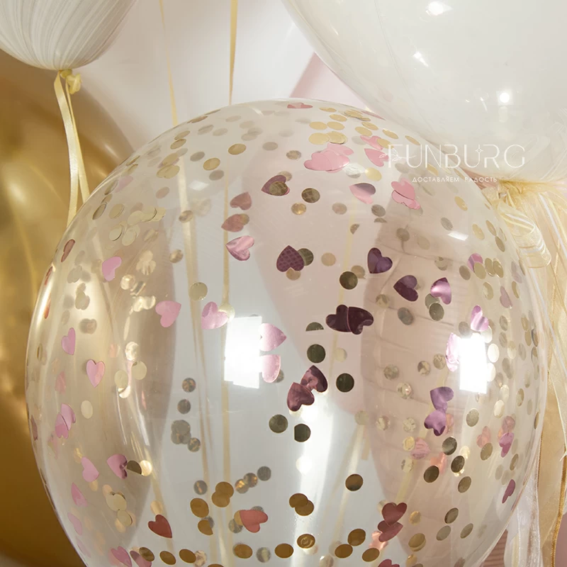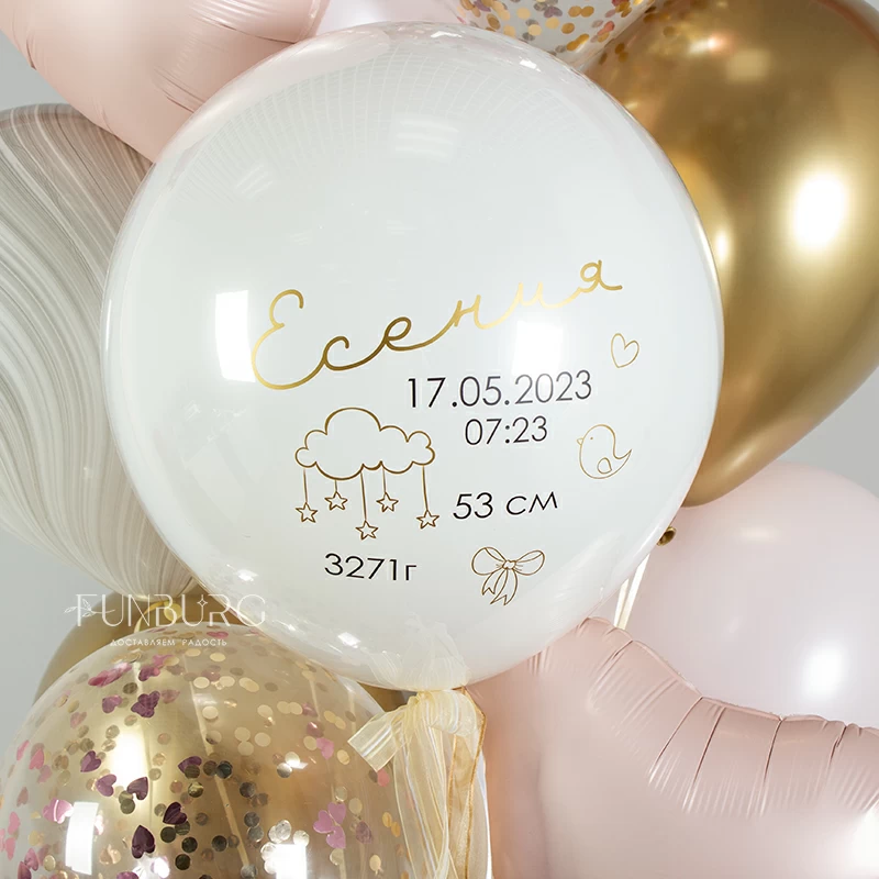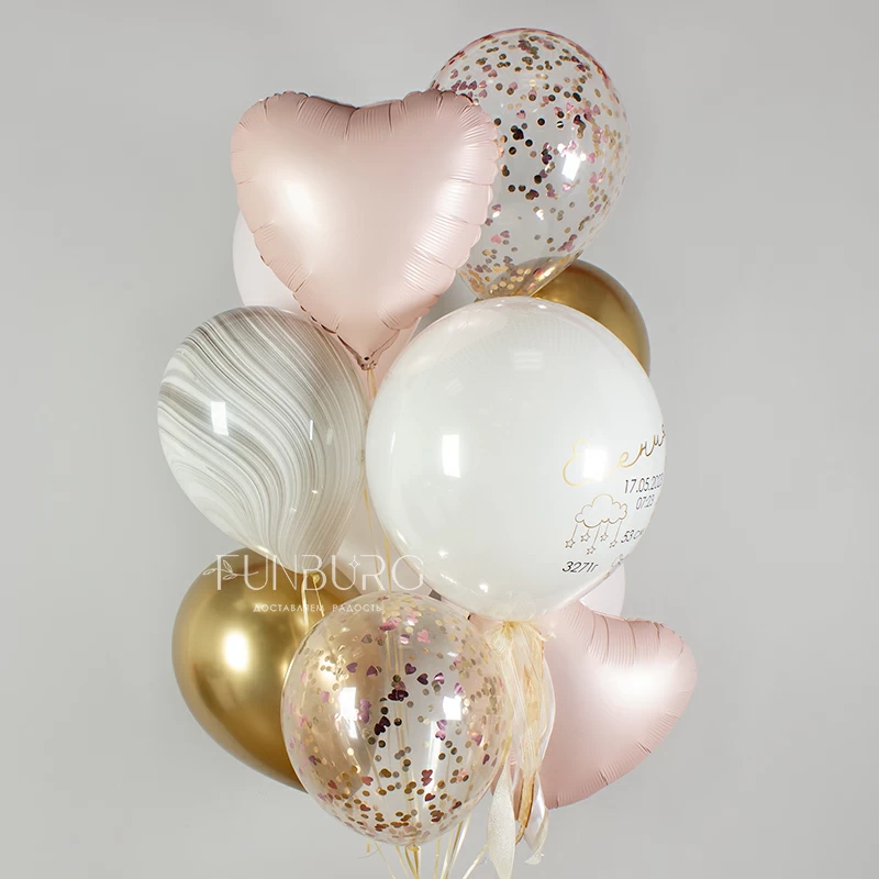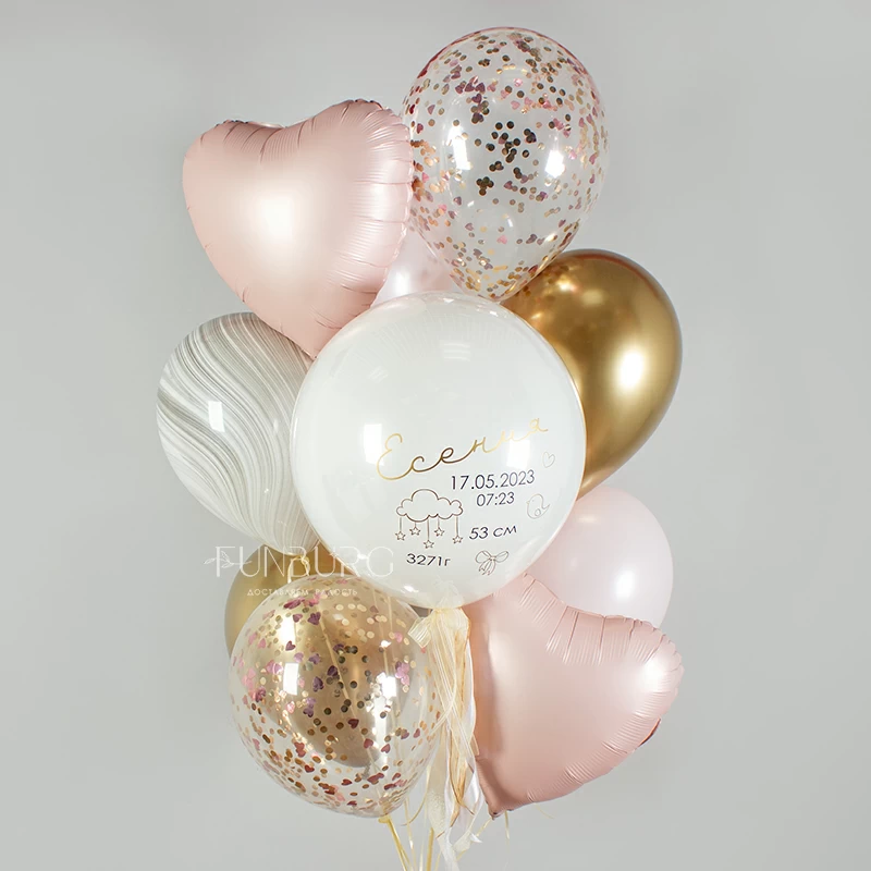 Нежнейшая минималистичная связка шариков в мягкой бело-розово-золотой цветовой гамме, созданная для красивой встречи мамы и малышки дома! На большом центральном шарике с лентами можно написать имя малышки и метрику (а можно что-то изменить, если вам захочется).