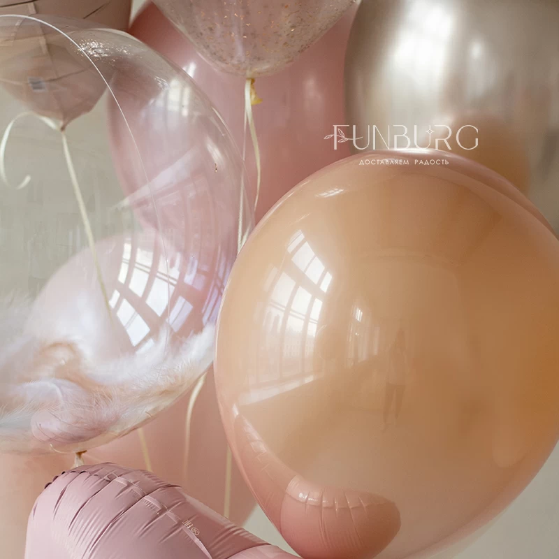 Волшебная с шариков в нежнейших, будто мягко перетекающих один в другой матовых и глянцевых оттенков пудрового и кремового, с завораживающим шаром Bubble с перьями цвета шампань и конфетт-сердечкам. Гармоничное сочетание разных текстур, тонкие тягучие цветовые переходы, лаконичность, бесконечная нежность, и мягкость, этот набор создан для особенных и самых трогательных моментов.