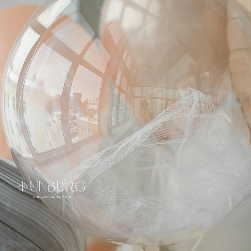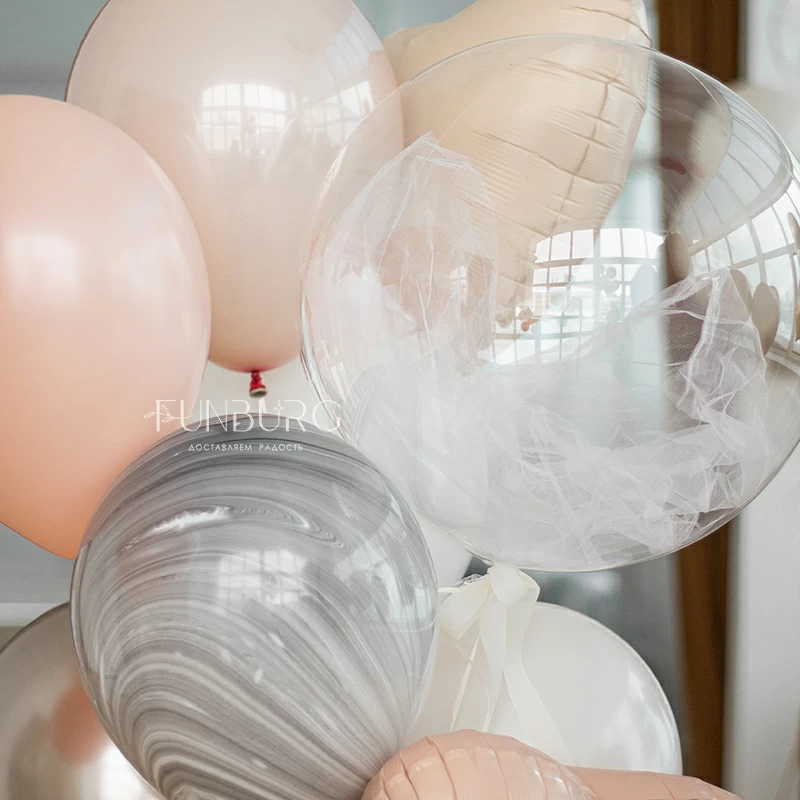 Волшебная связка шариков в нежнейших воздушных кремово-персиковых оттенках, с завораживающим шаром Bubble облачком фатина внутри и сердечками в тон создана для самых трогательных и важных событий.