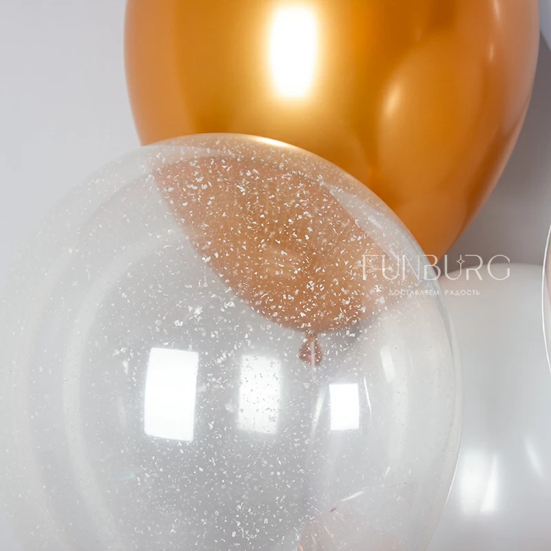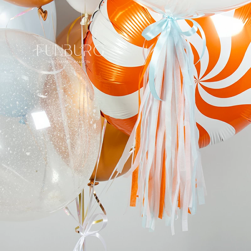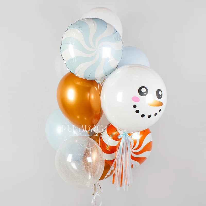 Для завершенности и целостности связка шариков перевязана лентой у основания. Вместо лица снеговика на глянцевый шар можно нанести любую надпись (просто укажите свое пожелание в комментариях к заказу).