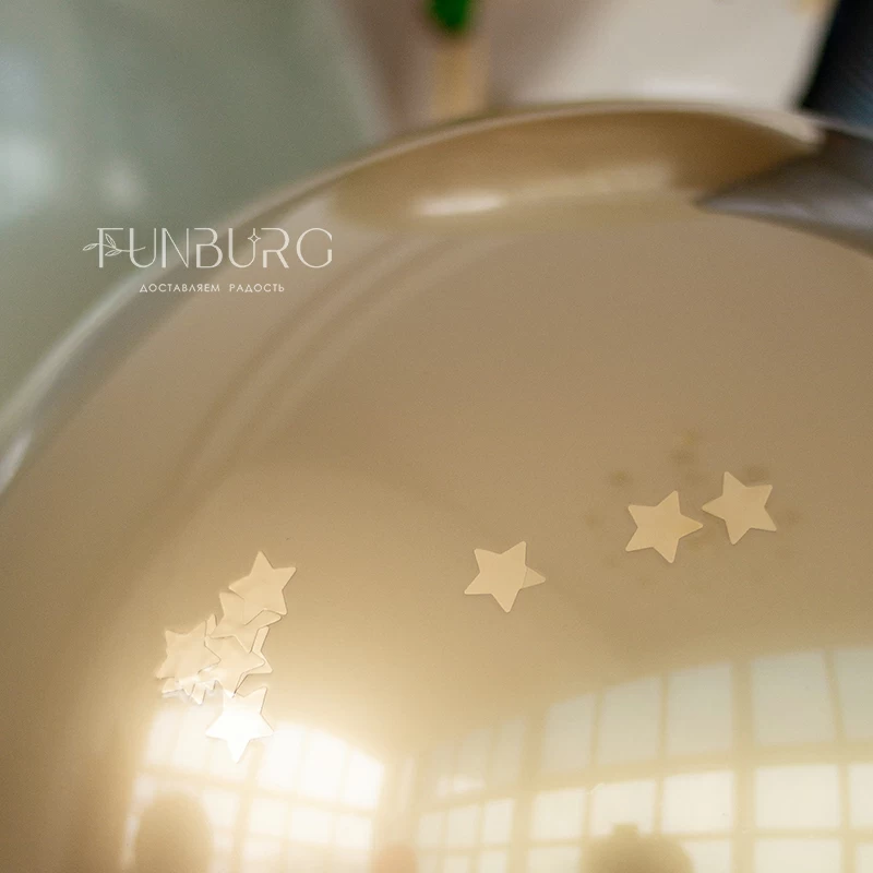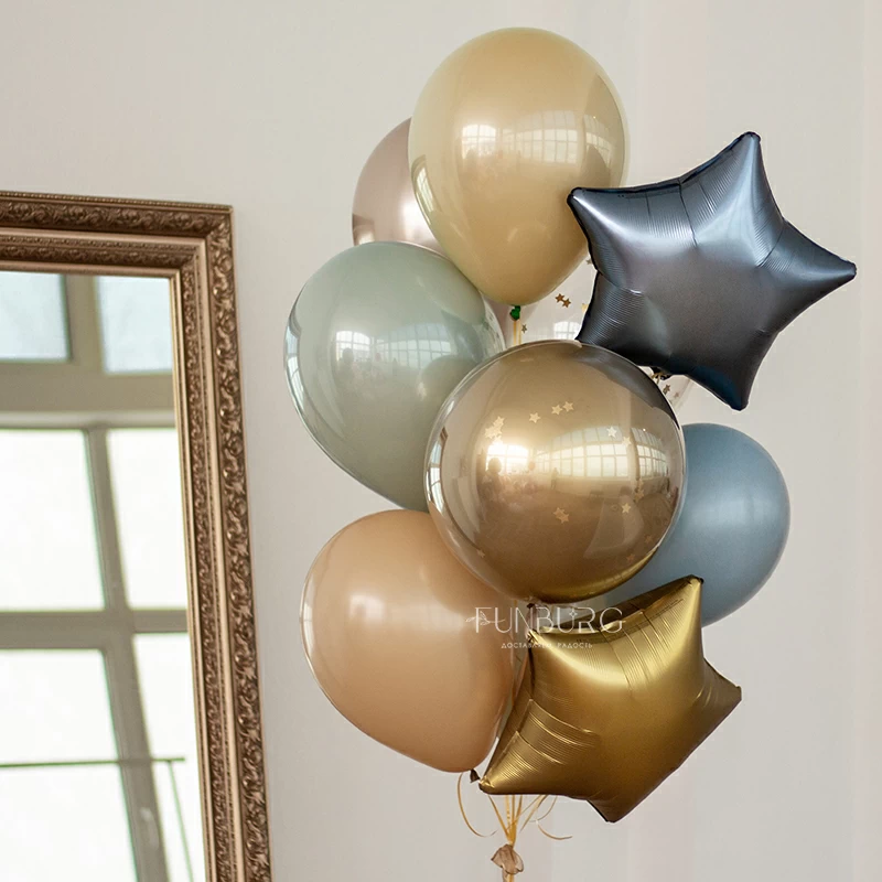 Сдержанная, но торжественная, гармоничная и немного загадочная связка шариков природных оттенков с добавлением сияющего зеркального шара chrome, шариков с конфетти-звездочками, шаров дизайнерских оттенков и звезд из фольги создан украшать самые важные события и стать прекрасным подарком даже для тех, кого сложно чем-то удивить.