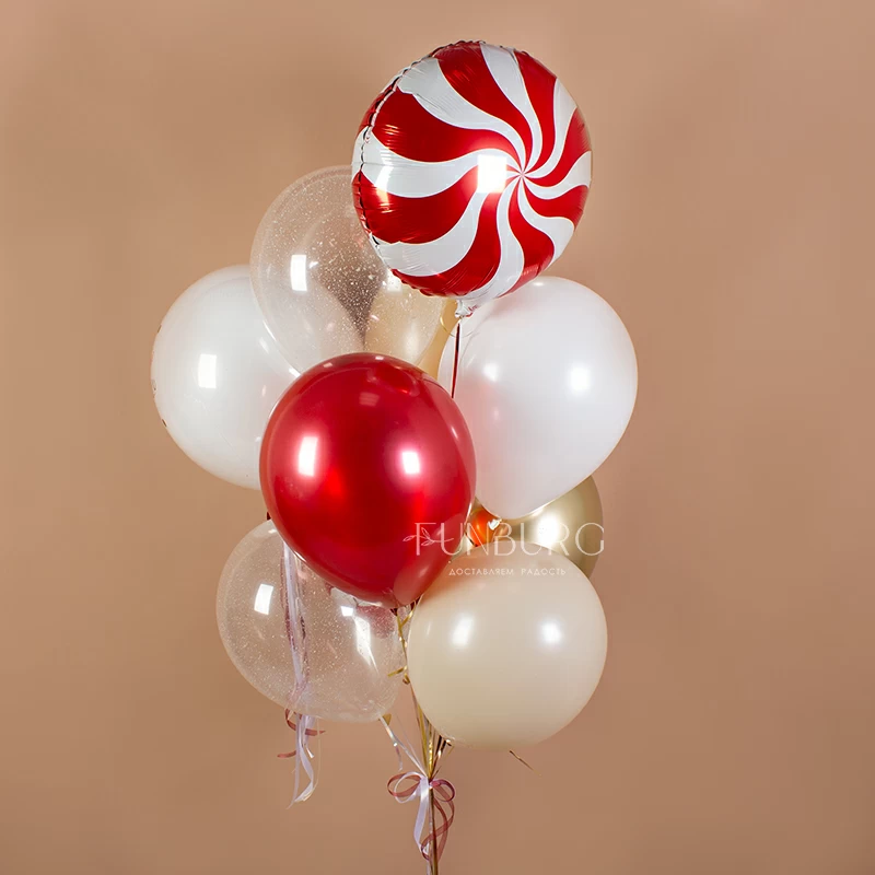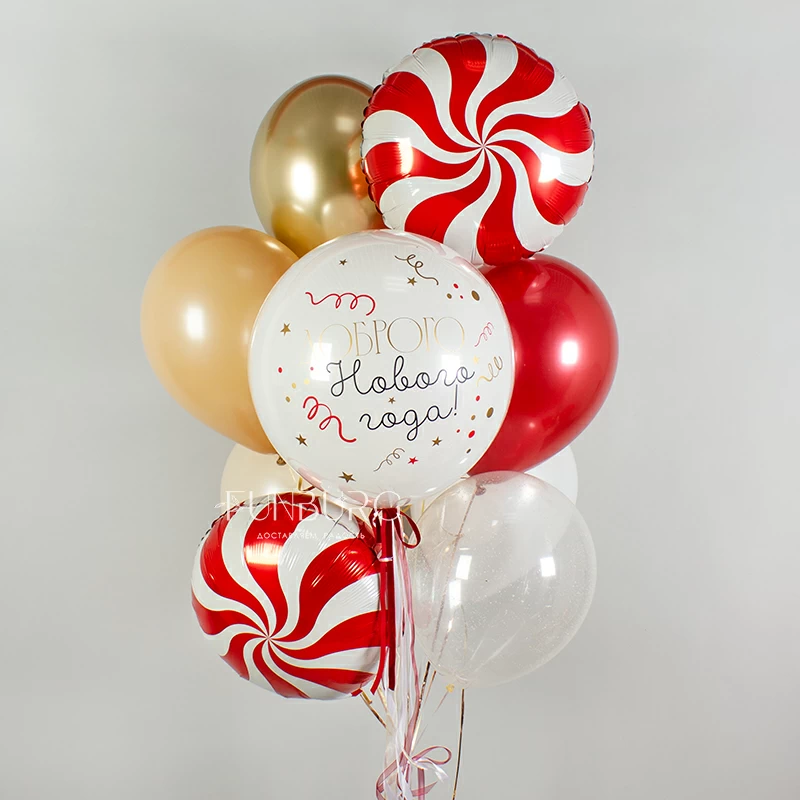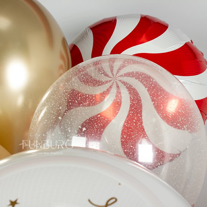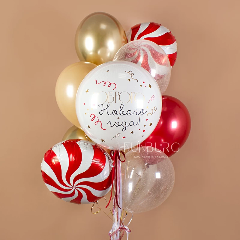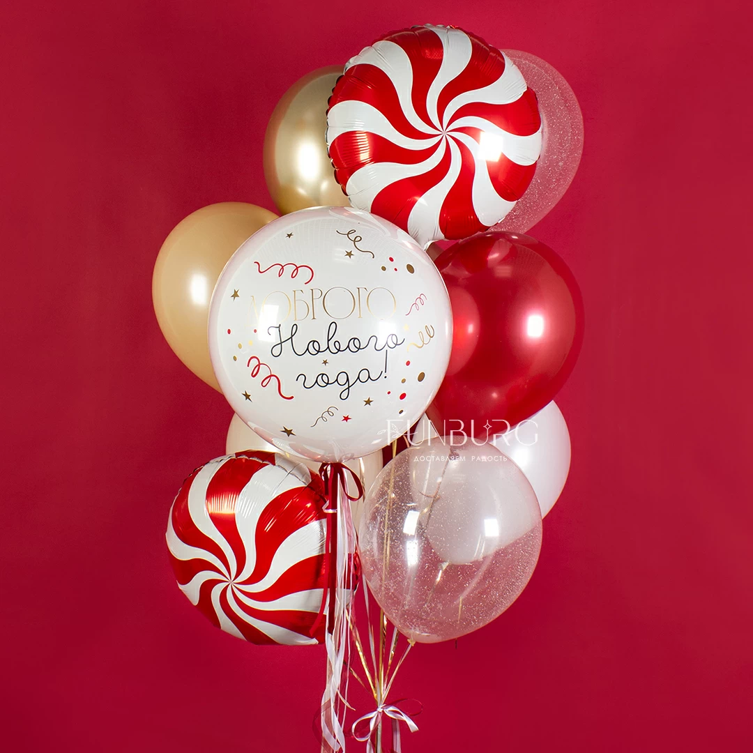 Волшебная новогодняя связка с белоснежным шаром с пожеланием, которое редко звучит, но кажется, очень необходимо всем сейчас. Здесь теплые оттенки ириски и кофе с молоком сочетаются со снежно-белым и празднично сияющими красным и золотым, а дополняют этот микс шарики со снежным конфетти и яркие карамельки. Для самого доброго Нового года!